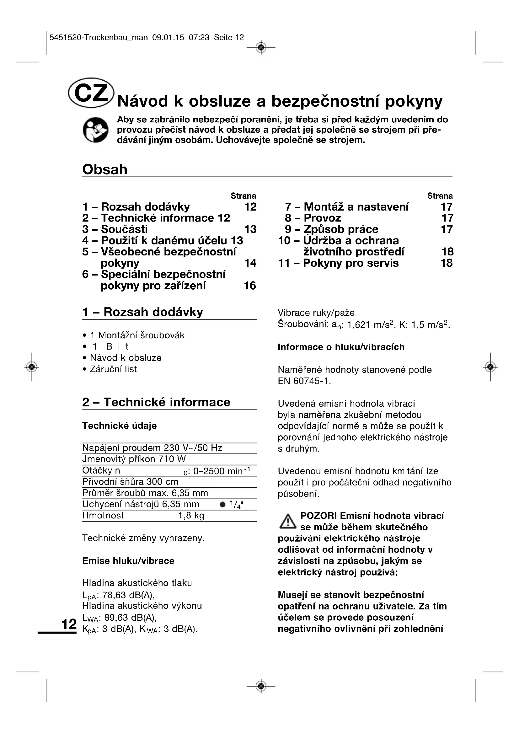 Informace o hluku/vibracíchNaměřené hodnoty stanovené podleEN 60745-1.Uvedená emisní hodnota vibracíbyla naměřena zkušební metodouodpovídající normě a může se použít kporovnání jednoho elektrického nástrojes druhým.Uvedenou emisní hodnotu kmitání lzepoužít i pro počáteční odhad negativníhopůsobení.POZOR! Emisní hodnota vibracíse může během skutečnéhopoužívání elektrického nástrojeodlišovat od informační hodnoty vzávislosti na způsobu, jakým seelektrický nástroj používá;Musejí se stanovit bezpečnostníopatření na ochranu uživatele. Za tímúčelem se provede posouzení negativního ovlivnění při zohlednění Návod k obsluze a bezpečnostní pokyny Aby se zabránilo nebezpečí poranění, je třeba si před každým uvedením doprovozu přečíst návod k obsluze a předat jej společně se strojem při pře-dávání jiným osobám. Uchovávejte společně se strojem. Strana 1 – Rozsah dodávky 12 2 – Technické informace 12 3 – Součásti 13 4 – Použití k danému účelu 13 5 – Všeobecné bezpečnostní pokyny 14 6 – Speciální bezpečnostní pokyny pro zařízení 16 Strana 7 – Montáž a nastavení 17 8 – Provoz 17 9 – Způsob práce 17 10 – Údržba a ochrana životního prostředí 18 11 – Pokyny pro servis 18 Obsah