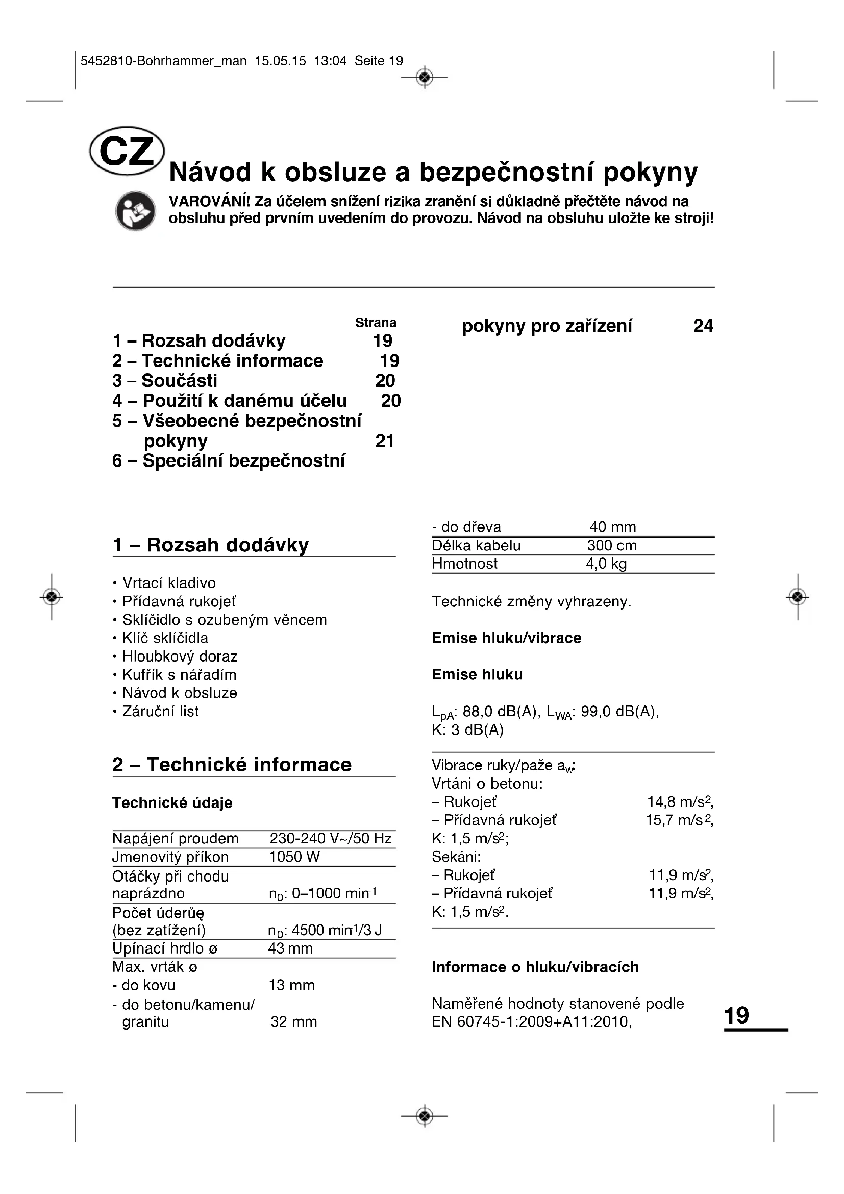 Informace o hluku/vibracíchNaměřené hodnoty stanovené podleEN 60745-1:2009+A11:2010, Návod k obsluze a bezpečnostní pokyny VAROVÁNÍ! Za účelem snížení rizika zranění si důkladně přečtěte návod naobsluhu před prvním uvedením do provozu. Návod na obsluhu uložte ke stroji! Strana 1 – Rozsah dodávky 19 2 – Technické informace 19 3 – Součásti 20 4 – Použití k danému účelu 20 5 – Všeobecné bezpečnostní pokyny 21 6 – Speciální bezpečnostní pokyny pro zařízení 24 5452810-Bohrhammer_man 15.05.15 13:04 Seite 19EN 60745-2-6:2010.