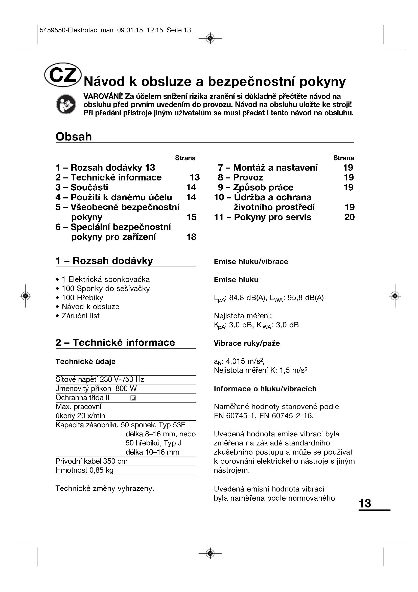 - 1 Elektrická sponkovačka• 100 Sponky do sešívačky• 100 Hřebíky• Návod k obsluze• Záruční list 2 – Technické informace Technické údajeSíťové napětí 230 V~/50 HzJmenovitý příkon 800 W Ochranná třída IIMax. pracovníúkony 20 x/minKapacita zásobníku 50 sponek, Typ 53Fdélka 8–16 mm, nebo50 hřebíků, Typ Jdélka 10–16 mmPřívodní kabel 350 cmHmotnost 0,85 kgTechnické změny vyhrazeny.Emise hluku/vibraceEmise hluku