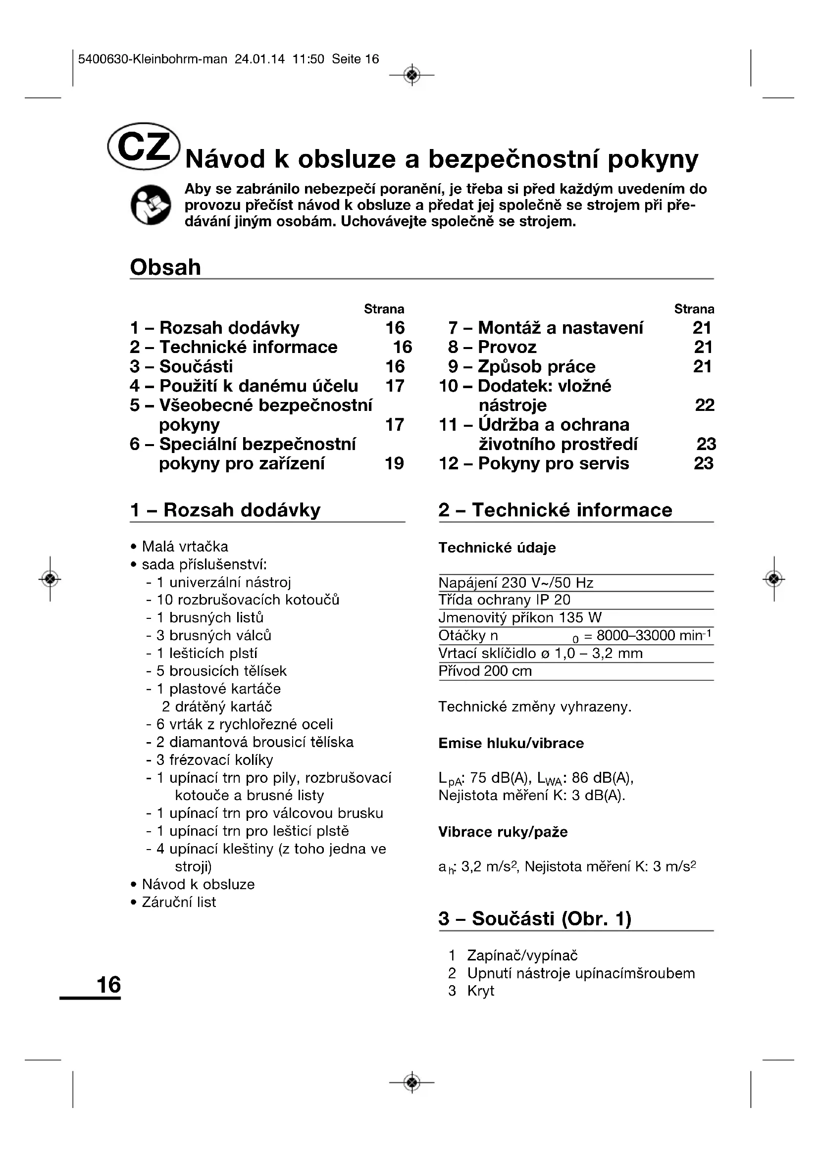 - I po uplynutí záruční doby jsme vám rádi k dispozici a případné opravy přístrojů Meisterbasic provedeme za výhodné ceny. 5400630-Kleinbohrm-man 24.01.14 11:50 Seite 2425 1 – Étendue des fournitures