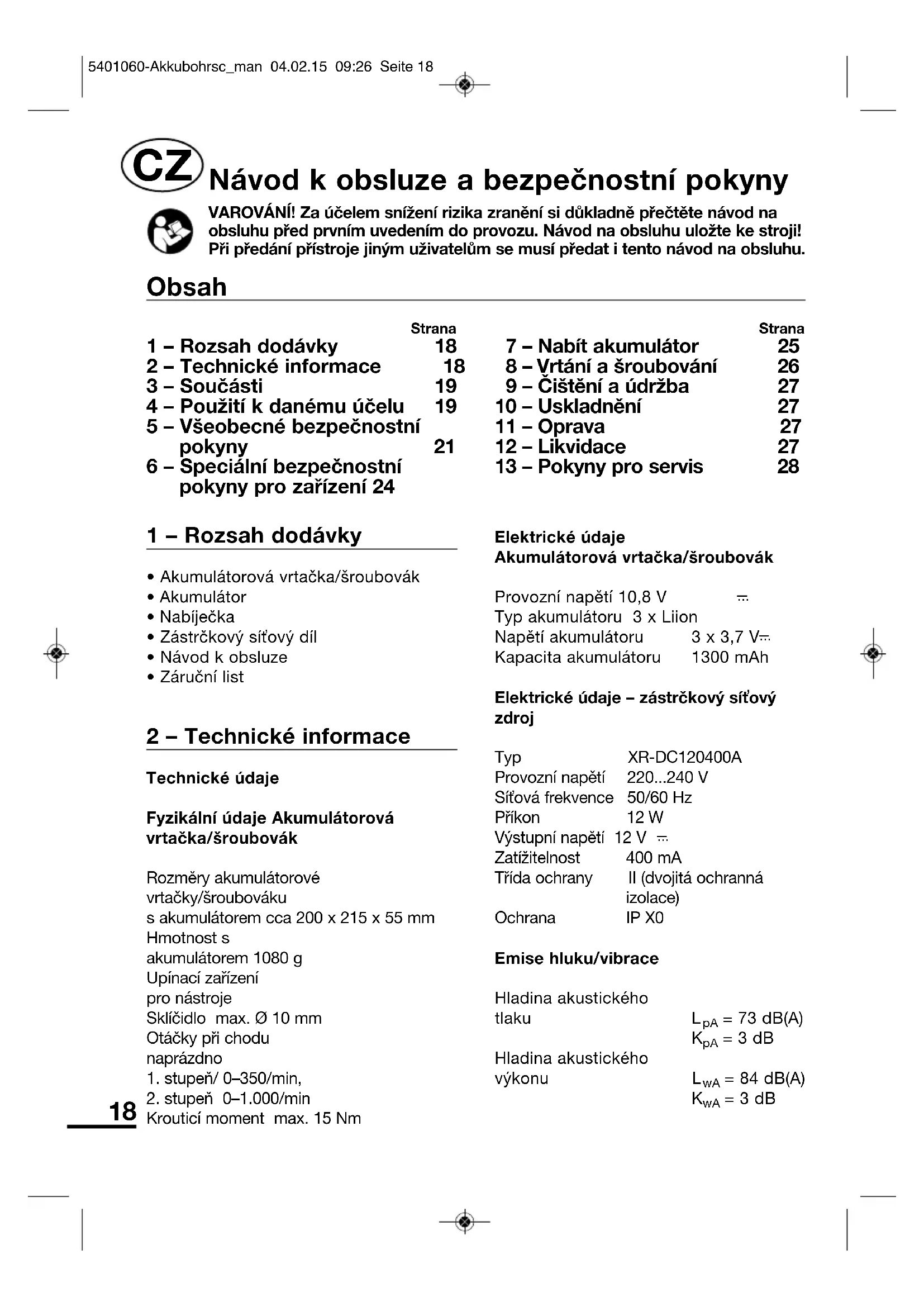 = 3 dBStrana 1 – Rozsah dodávky 18 2 – Technické informace 18 3 – Součásti 19 4 – Použití k danému účelu 19 5 – Všeobecné bezpečnostní pokyny 21 6 – Speciální bezpečnostní pokyny pro zařízení 24 Strana 7 – Nabít akumulátor 25 8 – Vrtání a šroubování 26 9 – Čištění a údržba 27 10 – Uskladnění 27 11 – Oprava 27 12 – Likvidace 27 13 – Pokyny pro servis 28 Obsah Návod k obsluze a bezpečnostní pokyny VAROVÁNÍ! Za účelem snížení rizika zranění si důkladně přečtěte návod naobsluhu před prvním uvedením do provozu. Návod na obsluhu uložte ke stroji!Při předání přístroje jiným uživatelům se musí předat i tento návod na obsluhu.
