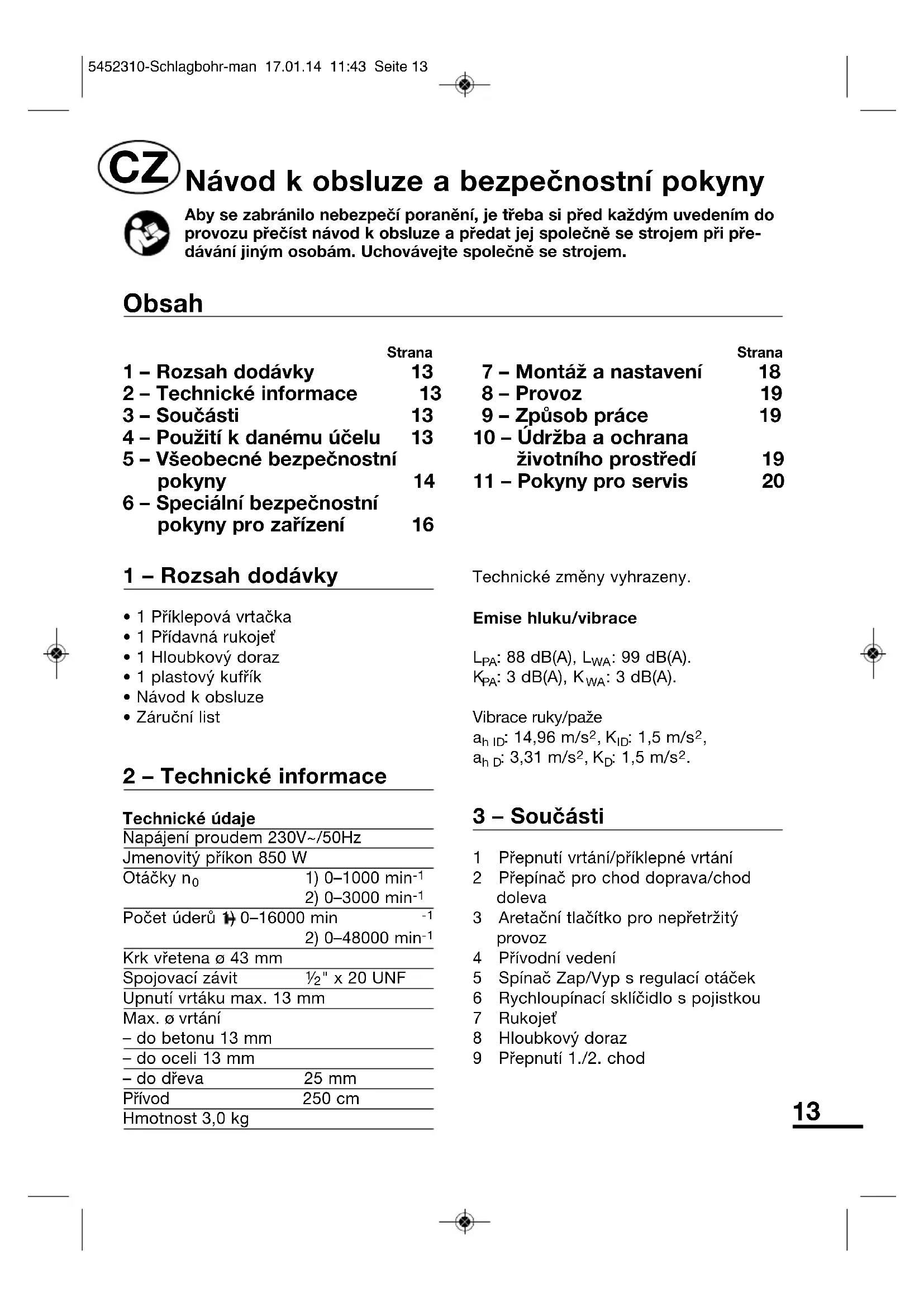 - I po uplynutí záruční doby jsme vám rádi k dispozici a případné opravy přístrojů MeisterCRAFT provedeme za výhodné ceny. 5452310-Schlagbohr-man 17.01.14 11:43 Seite 2021 1 – Étendue des fournitures