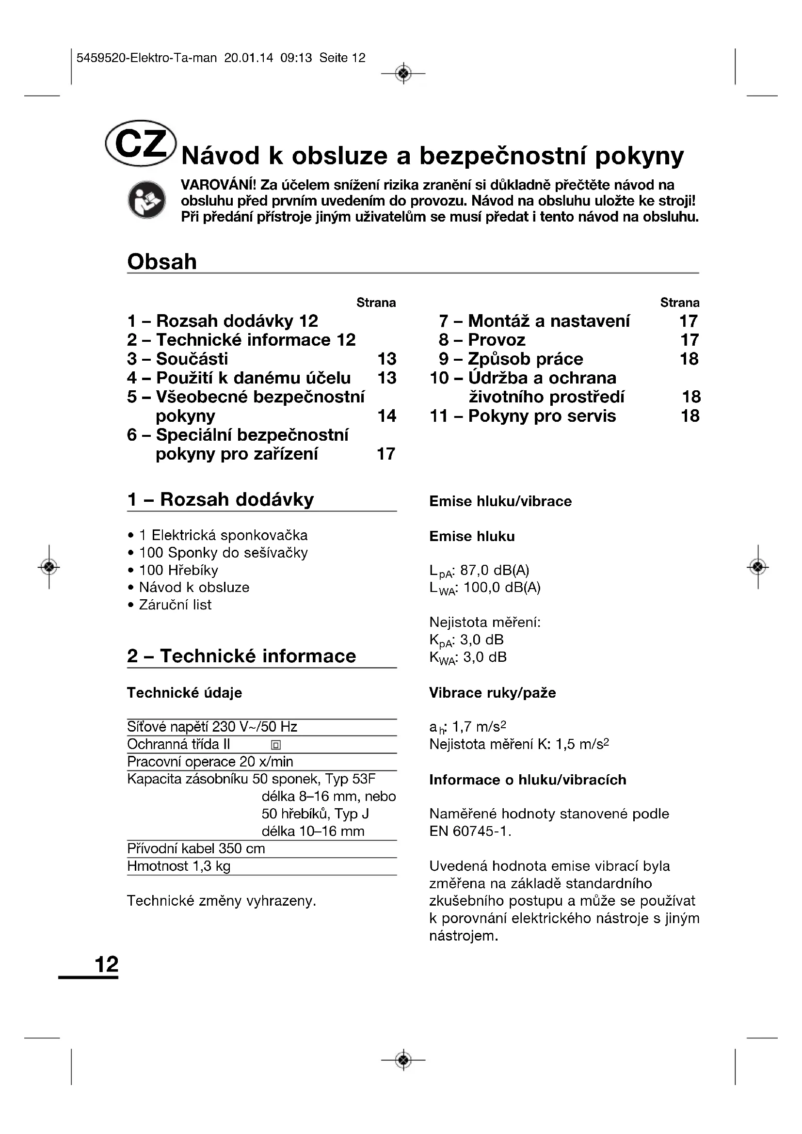 : 1,7 m/s Nejistota měření K: 1,5 m/s Informace o hluku/vibracíchNaměřené hodnoty stanovené podleEN 60745-1.Uvedená hodnota emise vibrací bylazměřena na základě standardníhozkušebního postupu a může se používatk porovnání elektrického nástroje s jinýmnástrojem. Návod k obsluze a bezpečnostní pokyny VAROVÁNÍ! Za účelem snížení rizika zranění si důkladně přečtěte návod naobsluhu před prvním uvedením do provozu. Návod na obsluhu uložte ke stroji!Při předání přístroje jiným uživatelům se musí předat i tento návod na obsluhu. Strana 1 – Rozsah dodávky 12 2 – Technické informace 12 3 – Součásti 13 4 – Použití k danému účelu 13 5 – Všeobecné bezpečnostní pokyny 14 6 – Speciální bezpečnostní pokyny pro zařízení 17 Strana 7 – Montáž a nastavení 17 8 – Provoz 17 9 – Způsob práce 18 10 – Údržba a ochrana životního prostředí 18 11 – Pokyny pro servis 18 Obsah 5459520-Elektro-Ta-man 20.01.14 09:13 Seite 1213 Uvedená emisní hodnota vibrací byla naměřena podle normovaného zkušebního postupu a může se používat k porovnání jednoho elektrického nářadí s druhým. Uvedená emisní hodnota vibrací se může používat i na počáteční posouzení omezení. POZOR! Hodnota emise vibrací se může během používání elektrického nářadí odlišovat od uvedené hodnoty v závislosti na druhu a způsobu, jakým se elektrické nářadí používá. Musejí se stanovit bezpečnostní opatření na ochranu obsluhujícího personálu. K tomu se provede posouzení omezení při zohlednění skutečných podmínek používání. (Přitom je potřebné zohlednit všechny části provozního cyklu, tzn. i doby, během nichž je elektrické nářadí vypnuté, a doby, během nichž je sice zapnuté, avšak v chodu bez zatížení.) POZOR! Určitému obtěžování hlukem se u tohoto nástroje nelze vyhnout. Práce s vysokou intenzitou hluku proto přeložte na povolené a vyhrazené denní doby. Dodržujte příp. doby odpočinku a trvání práce omezte na nejnutnější. POZOR! Působení hluku může vést k poškození sluchu. Proto pracujte pouze s vhodnou ochranou sluchu. Osoby nacházející se v blízkosti by rovněž měly nosit vhodnou ochranu sluchu. 3 – Součásti 1 Hlavní vypínač 2 Kontaktní spínač 3 Spouštěč 4 Zásobník 5 Pojistka zásobníku 6 Připojovací kabel 7Rukojeť 8 Vyhazovač sponek/hřebíků 4 – Použití k danému účelu Tato elektrická sponkovačka je s uvedenými sponkami a hřebíky vhodná k připevňování dřevěných lišt, drátěného pletiva, asfaltové lepenky, fólií, lepenky, těsnicích profilů, dekoračních a potahových látek atd. na dřevu a dalších vhodných podkladech. Všechny ostatní způsoby použití jsou výslovně vyloučeny. Tento přístroj není určený k používání osobami (včetně dětí) s omezenými fyzickými, smyslovými nebo duševními schopnostmi či s nedostatkem zkušeností a/nebo poznatků, kromě případů, pokud jsou pod dozorem osoby zodpovědné za jejich bezpečnost, nebo pokud obdrží pokyny týkající se používání přístroje. Děti musejí být pod dozorem, aby se zajistilo, že si s přístrojem nebudou hrát. Tento nástroj je určen jen k domácímu použití. Použití v rozporu s účelem Veškerá použití přístroje, která nejsou uvedena v kapitole „Použití v souladu s účelem“, jsou považována za použití v rozporu s účelem. Použití, pro které není elektrický nástroj určen, může mít za následek ohrožení a úrazy. Nepoužívejte žádné příslušenství, které není zvlášť určeno pro tento elektrický nástroj. Samotná skutečnost, že je možné příslušenství upevnit k vašemu elektrickému přístroji, nezaručuje bezpečné použití. 5459520-Elektro-Ta-man 20.01.14 09:13 Seite 1314 Přípustný počet zdvihů vloženého nástroje musí minimálně odpovídat hodnotě maximálního počtu zdvihů uvedeného na elektrickém nástroji. Příslušenství, které se otáčí rychleji, než je povoleno, se může rozlomit a z nářadí odlétnout. Brusné nástroje, příruby, brusné talíře či jiné příslušenství musejí přesně padnout na brusné vřeteno vašeho elektrického nářadí. Vložné nástroje, které na brusné vřeteno elektrického nářadí přesně nepadnou, se otáčejí nerovnoměrně, velmi silně vibrují a mohou vést ke ztrátě kontroly. Hrozí nebezpečí úrazu. Za všechny takto vzniklé hmotné škody a úrazy osob, vzniklé následkem nesprávného používání, ručí uživatel přístroje. Při použití jiných nebo neoriginálních součástí na stroji pozbývá záruka výrobce platnost. Zbytková rizika: Návod k obsluze k tomuto elektrickému nástroji obsahuje podrobné pokyny k bezpečné práci s elektrickými nástroji. Každý elektrický nástroj ale zahrnuje určitá zbytková rizika, která nelze zcela vyloučit ani použitím provedených bezpečnostních a ochranných zařízení. Z tohoto důvodu vždy obsluhujte elektrické nástroje s potřebnou opatrností. Zbytková rizika mohou být například: