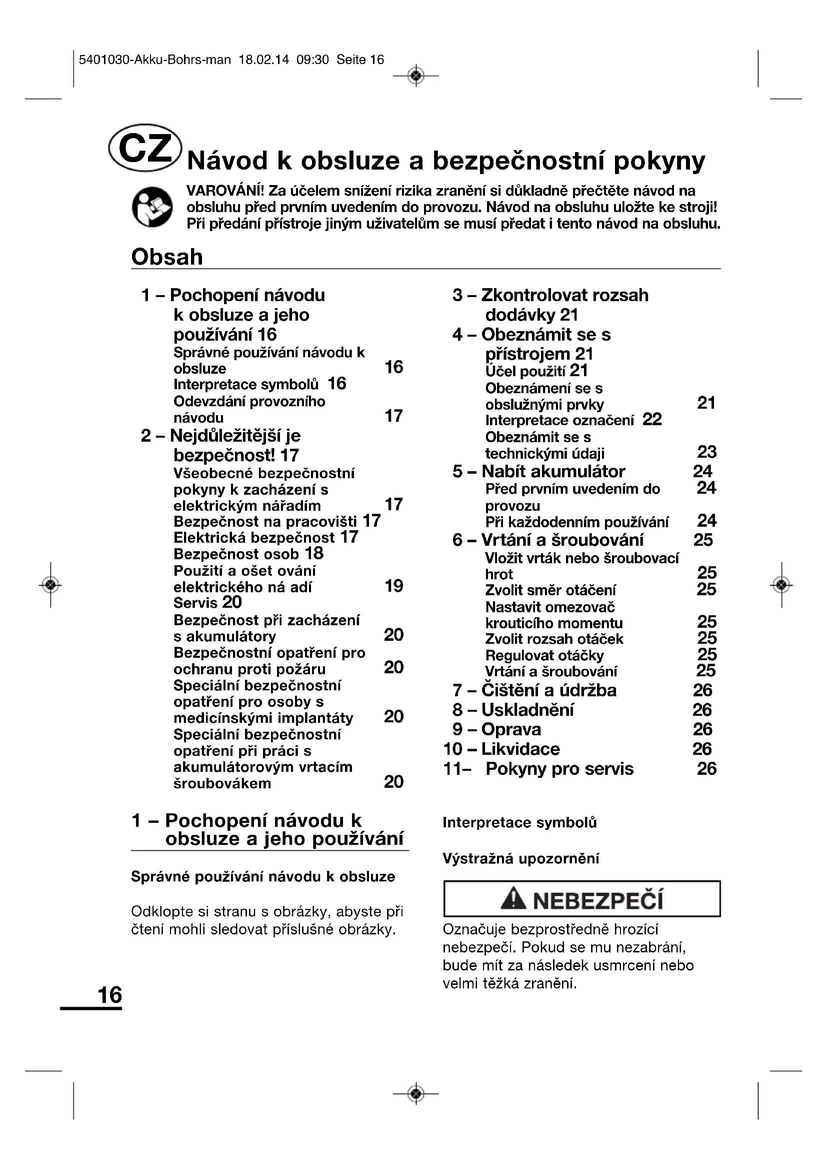 - Auch nach Ablauf der Garantiezeit sind wir für Sie da und werden eventuelle Reparaturen an Meister- Geräten kostengünstig ausführen. 5401030-Akku-Bohrs-man 18.02.14 09:30 Seite 151 – Pochopení návodu k obsluze a jeho používání Správné používání návodu k obsluzeOdklopte si stranu s obrázky, abyste přičtení mohli sledovat příslušné obrázky.Interpretace symbolůVýstražná upozorněníOznačuje bezprostředně hrozícínebezpečí. Pokud se mu nezabrání,bude mít za následek usmrcení nebovelmi těžká zranění. 1 – Pochopení návodu k obsluze a jeho používání 16 Správné používání návodu kobsluze Interpretace symbolů 16Odevzdání provozníhonávodu