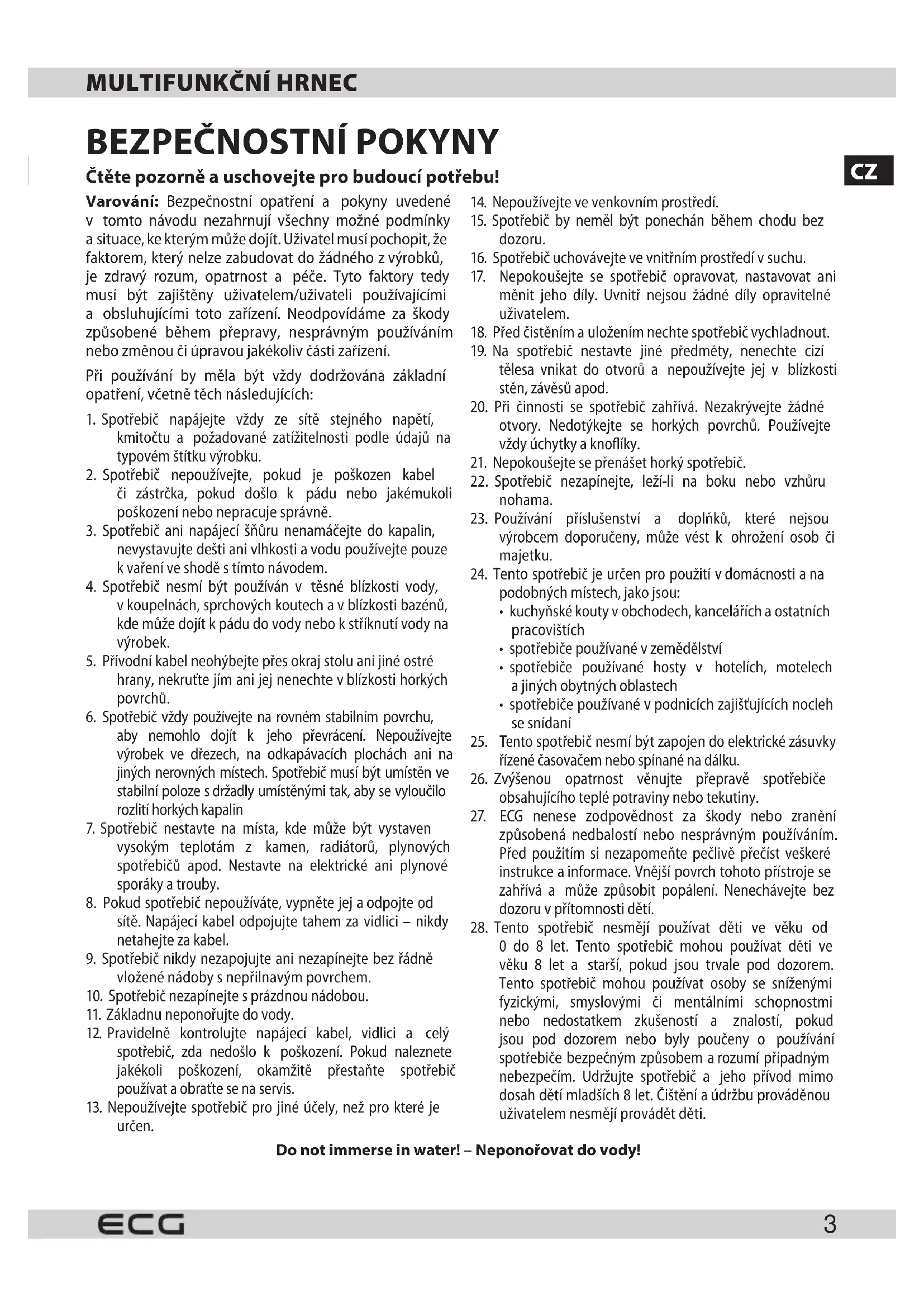 0 do 8 let. Tento spotřebič mohou používat děti ve věku 8 let a starší, pokud jsou trvale pod dozorem. Tento spotřebič mohou používat osoby se sníženými fyzickými, smyslovými či mentálními schopnostmi nebo nedostatkem zkušeností a znalostí, pokud jsou pod dozorem nebo byly poučeny o používání spotřebiče bezpečným způsobem arozumí případným nebezpečím. Udržujte spotřebič a jeho přívod mimo dosah dětí mladších 8 let. Čištění aúdržbu prováděnou uživatelem nesmějí provádět děti. Do not immerse in water! – Neponořovat do vody!CZ