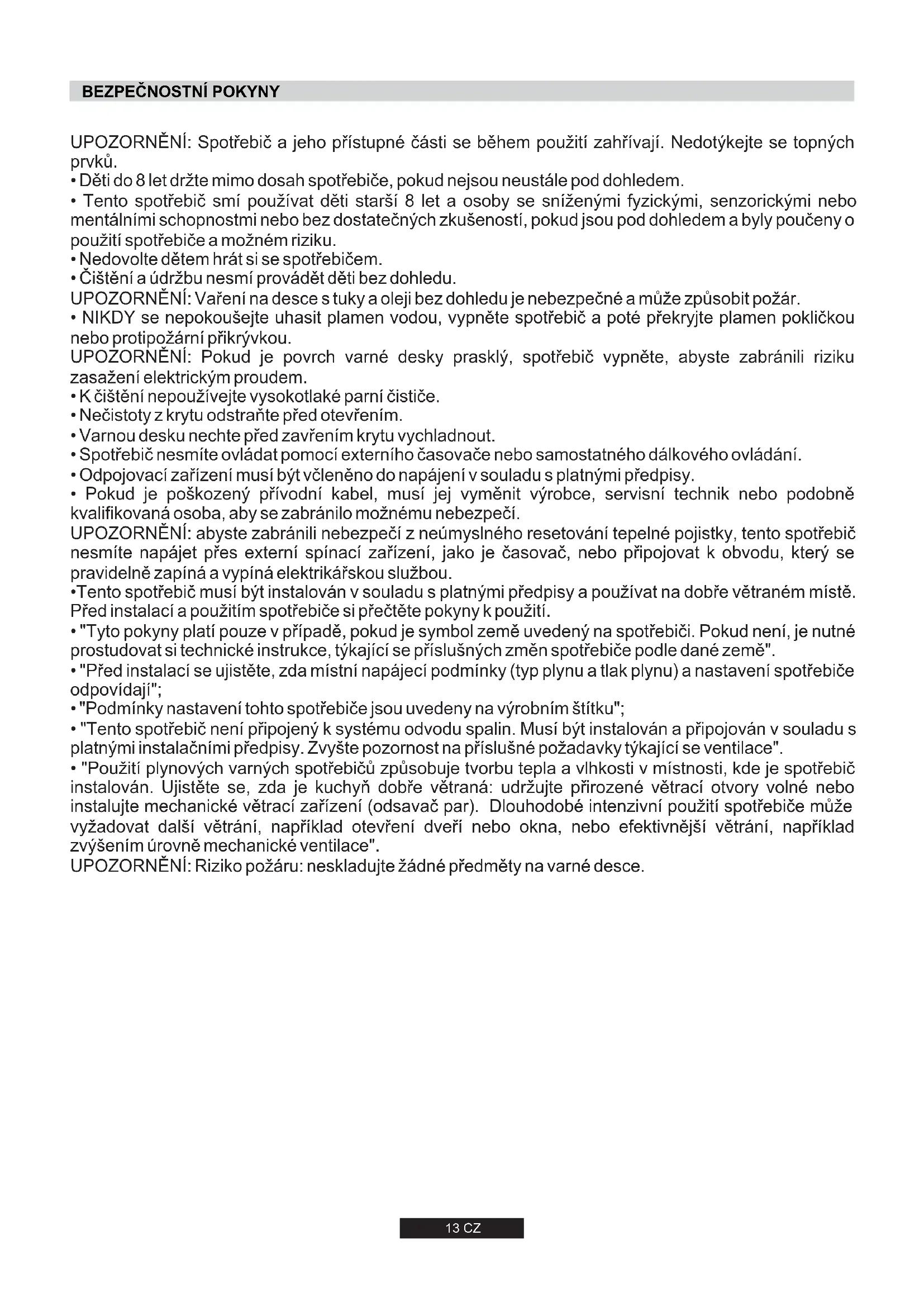 Pokud je 75 cm varná deska nad troubou, musí být přidán chladicí Ventilátor. Spotřebič nesmíte ovládat pomocí externího časovače nebo samostatného dálkového ovládání. 14 CZ INSTALACE DOMÁCÍCH SPOTŘEBIČŮ MŮŽE BÝT SLOŽITÁ OPERACE, KTERÁ, POKUD NENÍ PROVEDENA SPRÁVNĚ, MŮŽE VÁŽNĚ OHROZIT BEZPEČNOST UŽIVATELE. Z TOHOTO DŮVODU POŽÁDEJTE O INSTALACI KVALIFIKOVANÉHO SERVISNÍHO TECHNIKA, KTERÝ INSTALACI PROVEDE PODLE PLATNÝCH PŘEDPISŮ. V PŘÍPADĚ NEOPRÁVNĚNÉ INSTALACE VÝROBCE NENESE ŽÁDNOU ODPOVĚDNOST ZA TECHNICKÉ ZÁVADY VÝROBKU, KTERÉ MOHOU VÉST KE POŠKOZENÍ VÝROBKU NEBO ZRANĚNÍ OSOB.