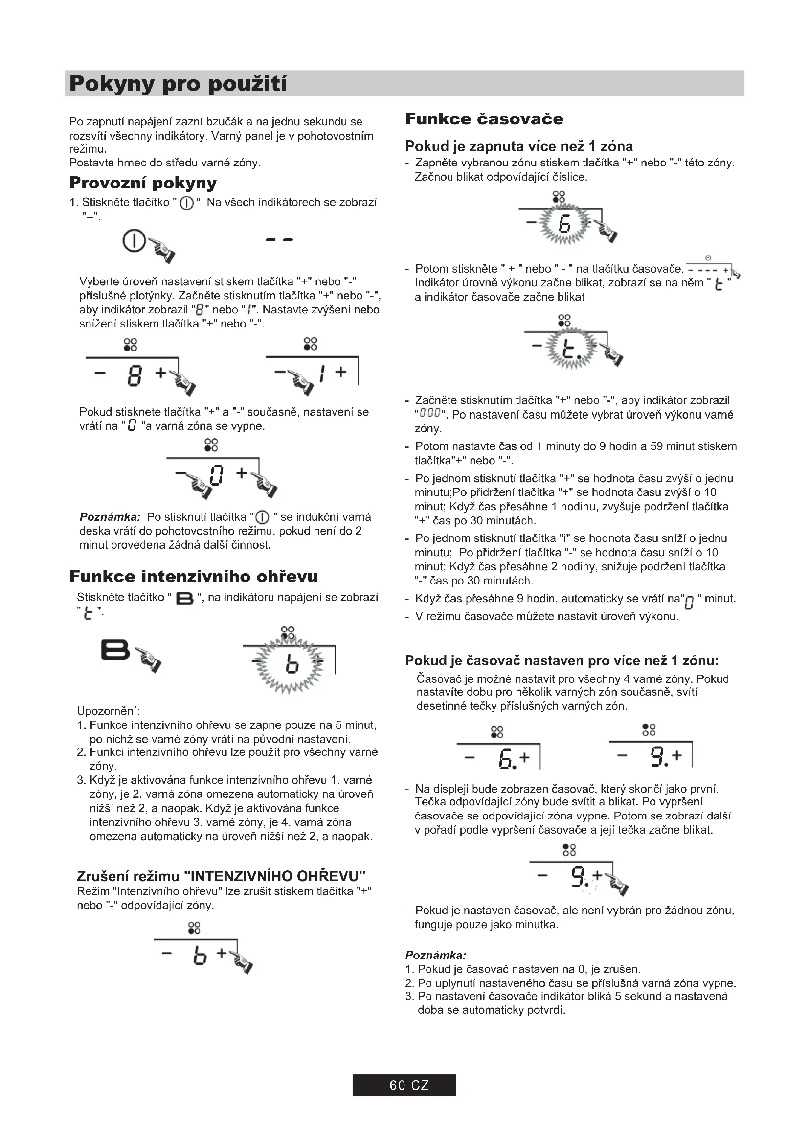 - Pokud je kabel poškozen nebo musí být vyměněn, musí tuto činnost provést zástupce prodejce pomocí určeného nářadí, aby se vyloučily možné nehody. Připojení ke zdroji napájení Kabel nesmí být ohnut ani stlačen. Zásuvka musí být připojena v souladu s příslušnými normami k jednopólovému jističi. Metoda připojení je znázorněna na obrázku (3): 58 CZ Grey L1 L2 N1 N2‐‐ Pokyny pro použití Po zapnutí napájení zazní bzučák a na jednu sekundu se rozsvítí všechny indikátory. Varný panel je v pohotovostním režimu.Postavte hrnec do středu varné zóny. Provozní pokyny 1. Stiskněte tlačítko " ". Na všech indikátorech se zobrazí "--".Vyberte úroveň nastavení stiskem tlačítka "+" nebo "-" příslušné plotýnky. Začněte stisknutím tlačítka "+" nebo "-", aby indikátor zobrazil " " nebo " ". Nastavte zvýšení nebo snížení stiskem tlačítka "+" nebo "-".Pokud stisknete tlačítka "+" a "-" současně, nastavení se vrátí na " "a varná zóna se vypne.Poznámka: Po stisknutí tlačítka " " se indukční varná deska vrátí do pohotovostního režimu, pokud není do 2 minut provedena žádná další činnost. Funkce intenzivního ohřevu Stiskněte tlačítko " ", na indikátoru napájení se zobrazí " ".Upozornění:1. Funkce intenzivního ohřevu se zapne pouze na 5 minut, po nichž se varné zóny vrátí na původní nastavení.2. Funkci intenzivního ohřevu lze použít pro všechny varné zóny.3. Když je aktivována funkce intenzivního ohřevu 1. varné zóny, je 2. varná zóna omezena automaticky na úroveň nižší než 2, a naopak. Když je aktivována funkce intenzivního ohřevu 3. varné zóny, je 4. varná zóna omezena automaticky na úroveň nižší než 2, a naopak.Zrušení režimu "INTENZIVNÍHO OHŘEVU"Režim "Intenzivního ohřevu" lze zrušit stiskem tlačítka "+" nebo "-" odpovídající zóny. Funkce časovače Pokud je zapnuta více než 1 zóna- Zapněte vybranou zónu stiskem tlačítka "+" nebo "-" této zóny. Začnou blikat odpovídající číslice.- Potom stiskněte " + " nebo " - " na tlačítku časovače. Indikátor úrovně výkonu začne blikat, zobrazí se na něm " " a indikátor časovače začne blikat- Začněte stisknutím tlačítka "+" nebo "-", aby indikátor zobrazil " ". Po nastavení času můžete vybrat úroveň výkonu varné zóny.- Potom nastavte čas od 1 minuty do 9 hodin a 59 minut stiskem tlačítka"+" nebo "-".- Po jednom stisknutí tlačítka "+" se hodnota času zvýší o jednu minutu;Po přidržení tlačítka "+" se hodnota času zvýší o 10 minut; Když čas přesáhne 1 hodinu, zvyšuje podržení tlačítka "+" čas po 30 minutách.- Po jednom stisknutí tlačítka "i" se hodnota času sníží o jednu minutu; Po přidržení tlačítka "-" se hodnota času sníží o 10 minut; Když čas přesáhne 2 hodiny, snižuje podržení tlačítka "-" čas po 30 minutách.- Když čas přesáhne 9 hodin, automaticky se vrátí na" " minut.- V režimu časovače můžete nastavit úroveň výkonu.