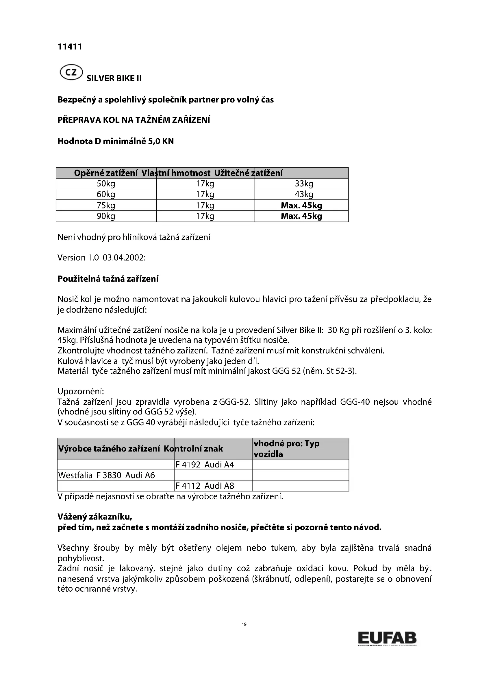 NÁVOD K OBSLUZE Silver Bike II Eufab