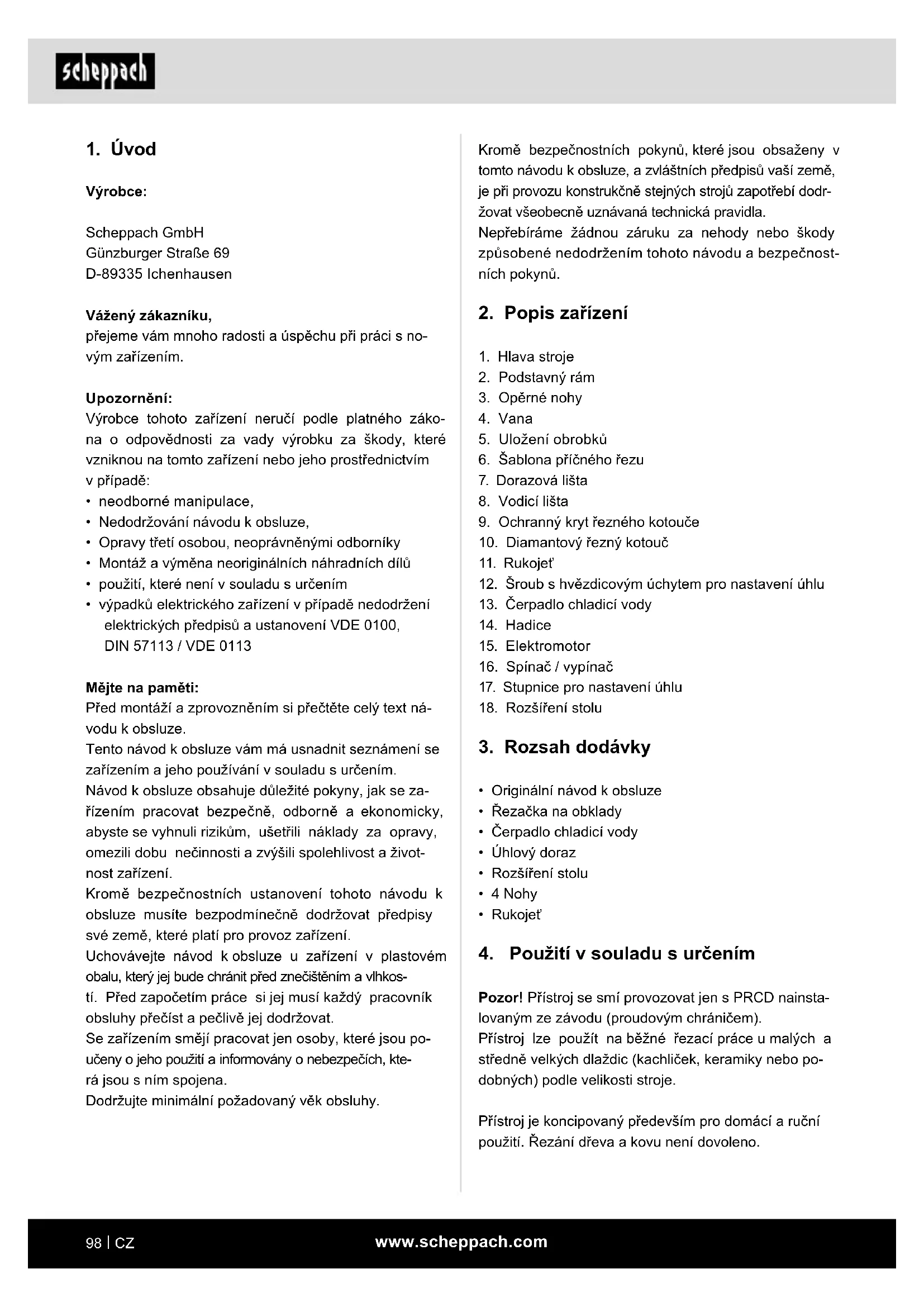 Výrobce: Scheppach GmbH Günzburger Straße 69 D-89335 Ichenhausen Vážený zákazníku, přejeme vám mnoho radosti a úspěchu při práci s no- vým zařízením. Upozornění: Výrobce tohoto zařízení neručí podle platného záko- na o odpovědnosti za vady výrobku za škody, které vzniknou na tomto zařízení nebo jeho prostřednictvím v případě: