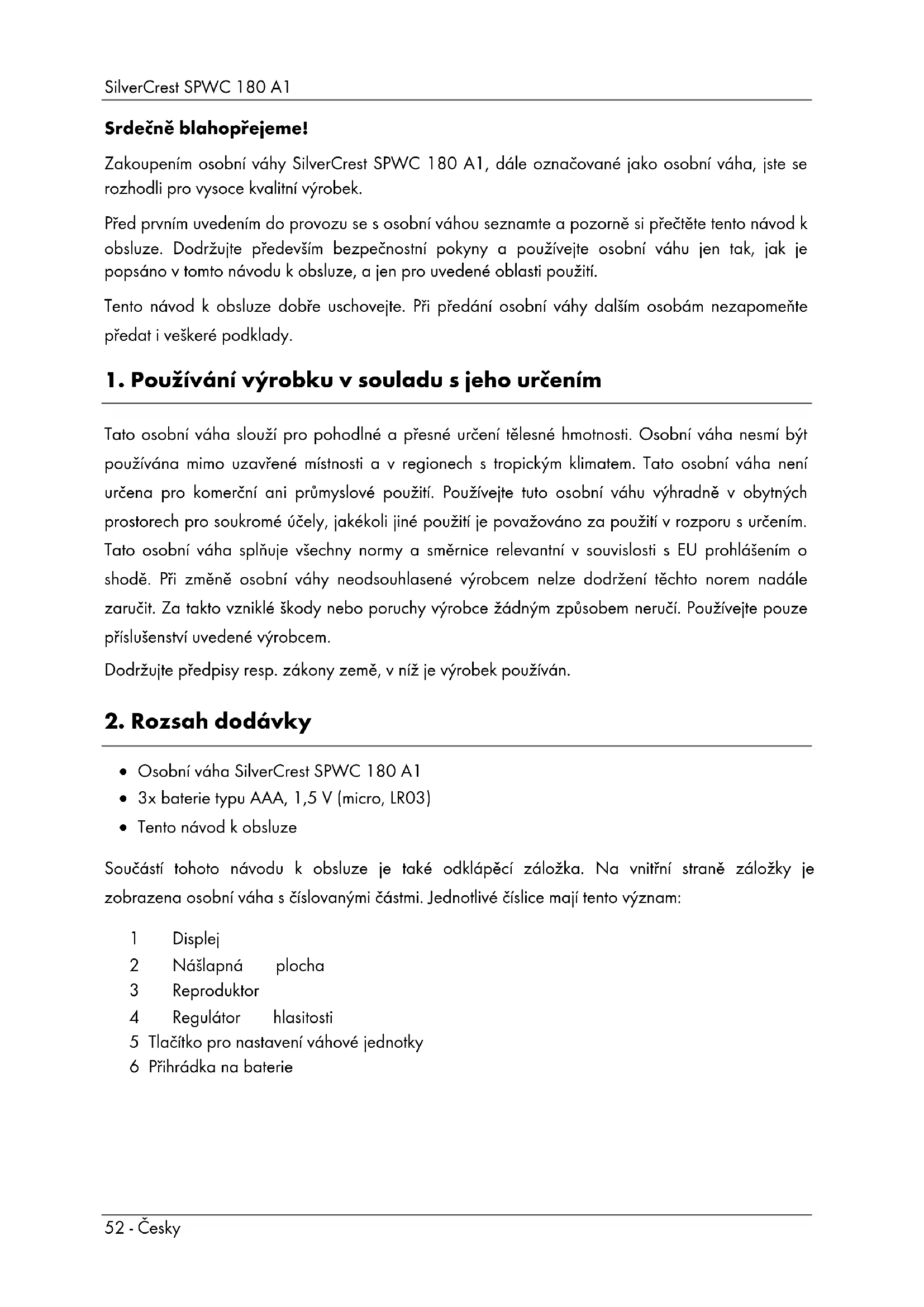 Osobní váha SilverCrest SPWC 180 A1 3x baterie typu AAA, 1,5 V (micro, LR03) Tento návod k obsluze Součástí tohoto návodu k obsluze je také odklápěcí záložka. Na vnitřní straně záložky je zobrazena osobní váha s číslovanými částmi. Jednotlivé číslice mají tento význam: 1 Displej 2 Nášlapná plocha 3 Reproduktor 4 Regulátor hlasitosti 5 Tlačítko pro nastavení váhové jednotky 6 Přihrádka na baterieSilverCrest SPWC 180 A1 Česky - 53