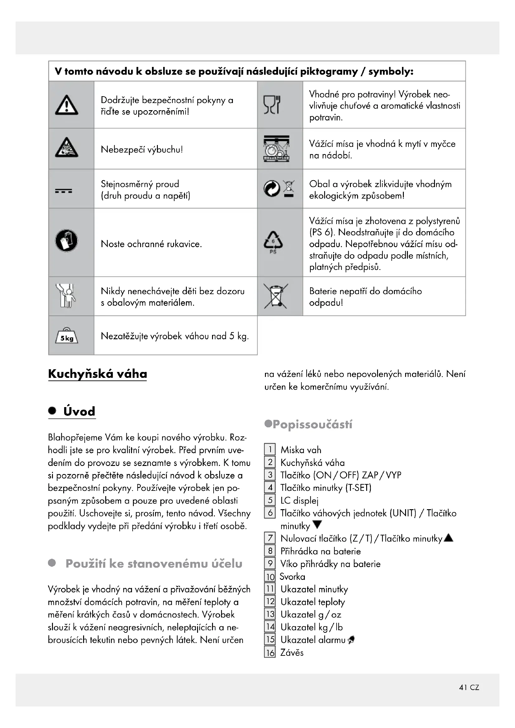 Použití ke stanovenému účelu Výrobek je vhodný na vážení a přivažování běžných množství domácích potravin, na měření teploty a měření krátkých časů v domácnostech. Výrobek slouží k vážení neagresivních, neleptajících a ne- brousících tekutin nebo pevných látek. Není určen na vážení léků nebo nepovolených materiálů. Není určen ke komerčnímu využívání.
