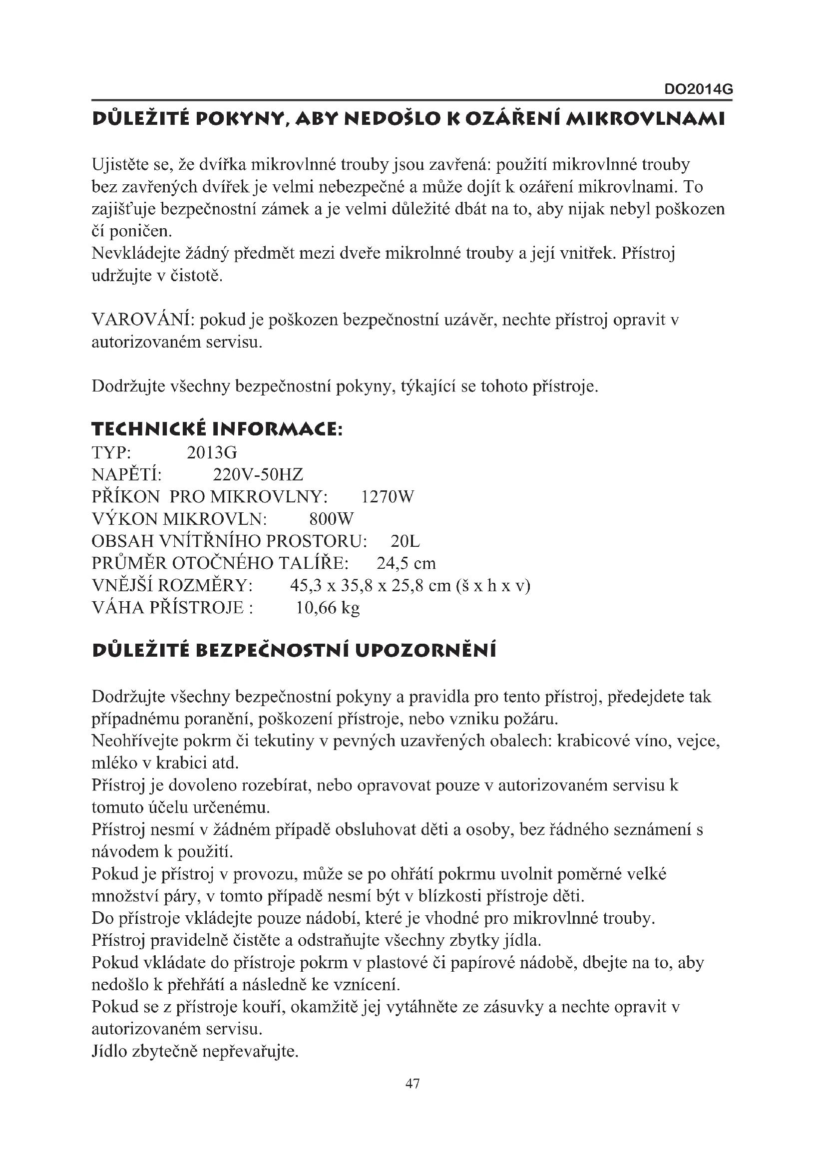 OBSAH VNÍTŘNÍHO PROSTORU: 20L PRŮMĚR OTOČNÉHO TALÍŘE: 24,5 cm VNĚJŠÍ ROZMĚRY: 45,3 x 35,8 x 25,8 cm (š x h x v) VÁHA PŘÍSTROJE : 10,66 kg DŮLEŽITÉ BEZPEČNOSTNÍ UPOZORNĚNÍ Dodržujte všechny bezpečnostní pokyny a pravidla pro tento přístroj, předejdete tak případnému poranění, poškození přístroje, nebo vzniku požáru. Neohřívejte pokrm či tekutiny v pevných uzavřených obalech: krabicové víno, vejce, mléko v krabici atd. Přístroj je dovoleno rozebírat, nebo opravovat pouze v autorizovaném servisu k tomuto účelu určenému. Přístroj nesmí v žádném případě obsluhovat děti a osoby, bez řádného seznámení s návodem k použití. Pokud je přístroj v provozu, může se po ohřátí pokrmu uvolnit poměrné velké množství páry, v tomto případě nesmí být v blízkosti přístroje děti. Do přístroje vkládejte pouze nádobí, které je vhodné pro mikrovlnné trouby. Přístroj pravidelně čistěte a odstraňujte všechny zbytky jídla. Pokud vkládate do přístroje pokrm v plastové či papírové nádobě, dbejte na to, aby nedošlo k přehřátí a následně ke vznícení. Pokud se z přístroje kouří, okamžitě jej vytáhněte ze zásuvky a nechte opravit v autorizovaném servisu. Jídlo zbytečně nepřevařujte. 47DO2014G V přístroji nic neuskladňujte. Například chléb, pečivo, sušenky. Před zapojením přístroje sejměte všechny vnější a vnitřní ochranné folie. V přístroji v žádném případě nevařte celá vajíčka na měkko či natvrdo, může dojít k velkému vzrůstu tlaku pod skořápkou a následné explozi. Při zácházení s přístrojem je velmi důležité dbát na všechny bezpečnostní pokyny. Do přístroje nevkládejte žádné chemické či těkavé látky. Tento přístroj je určen pouze pro ohřev pokrmů, ne k laboratorním účelům. Pokud je poškozen přívodní kabel, musí být vyměněn pouze v autorizovaném servisu. Přístroj nepoužívjejte ve venkovním prostředí. Přístroj nepoužívejte v blízkosti vody, odpadního koše nebo bazénu. Přístroj se může během provozu zahřívat. Kabel veďte tak, aby se nedotýkal horkých částí přístroje. Přívodní kabel nesmí viset přes okraj stolu. Pokud nebudete udržovat přístroj čistý, může to vést až k jeho poškození. Tento přístroj nesmí používat lidé nebo děti se smyslovou, pohybovou nebo mentální poruchou. Přístroj nesmí používat lidé, kteří se dostatečně neseznámili s návodem a bezpečnostními pravidly pro tento přístroj. Přístroj v žádném případě nesmí používat děti bez dozoru. VAROVÁNÍ: ujistěte se, že je přístroj vypnutý, pokud budete měnit žárovku. K čištění nepoužívejte parní čistič. K čištění skleněných dvířek nepoužívejte žádná abraziva nebo agresivní čistící prostředky, mohlo by dojít k poškrábání.Dvířka se mohou během provozu zahřívat. TYTO POKYNY SI USCHOVEJTE K POZDĚJŠÍMU NAHLÉDNUTÍ UPOZORNĚNÍ Varování: nedotýkejte se žádných elektrických částí ve vnitřku přístroje, mohlo by dojít ke zranění. Přístroj nerozebírejte.Zkontrolujte zda-li napětí přístroje odpovídá napětí ve Vaší elektrické síti. Přístroj nepoužívejte, pokud není zásuvka dobře uzemněna, je velmi důležité, aby přístroj byl dobře uzemněn.