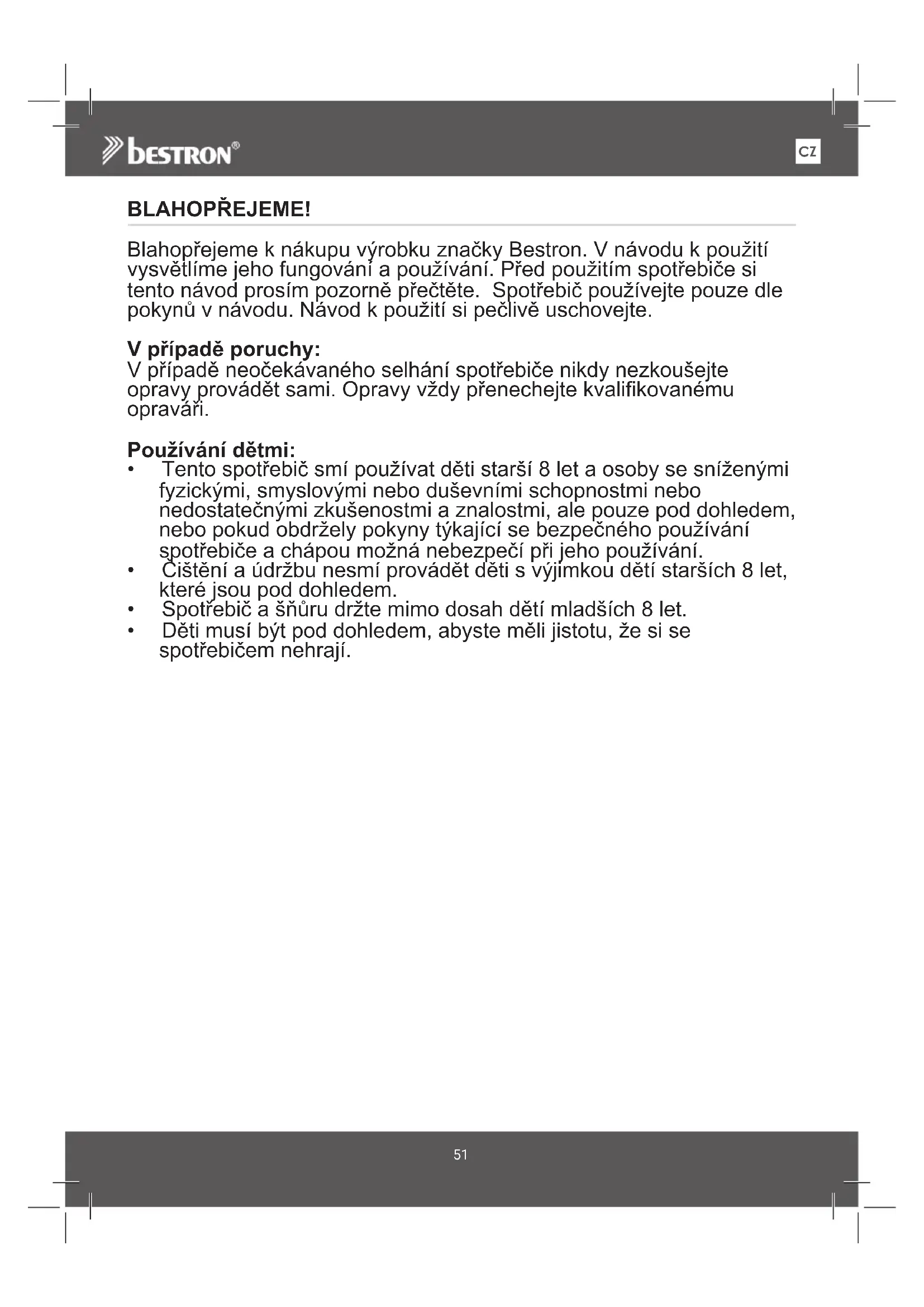 BlahopřejemeknákupuvýrobkuznačkyBestron.Vnávodukpoužití vysvětlímejehofungováníapoužívání.Předpoužitímspotřebičesi tentonávodprosímpozorněpřečtěte.Spotřebičpoužívejtepouzedle pokynůvnávodu.Návodkpoužitísipečlivěuschovejte.
