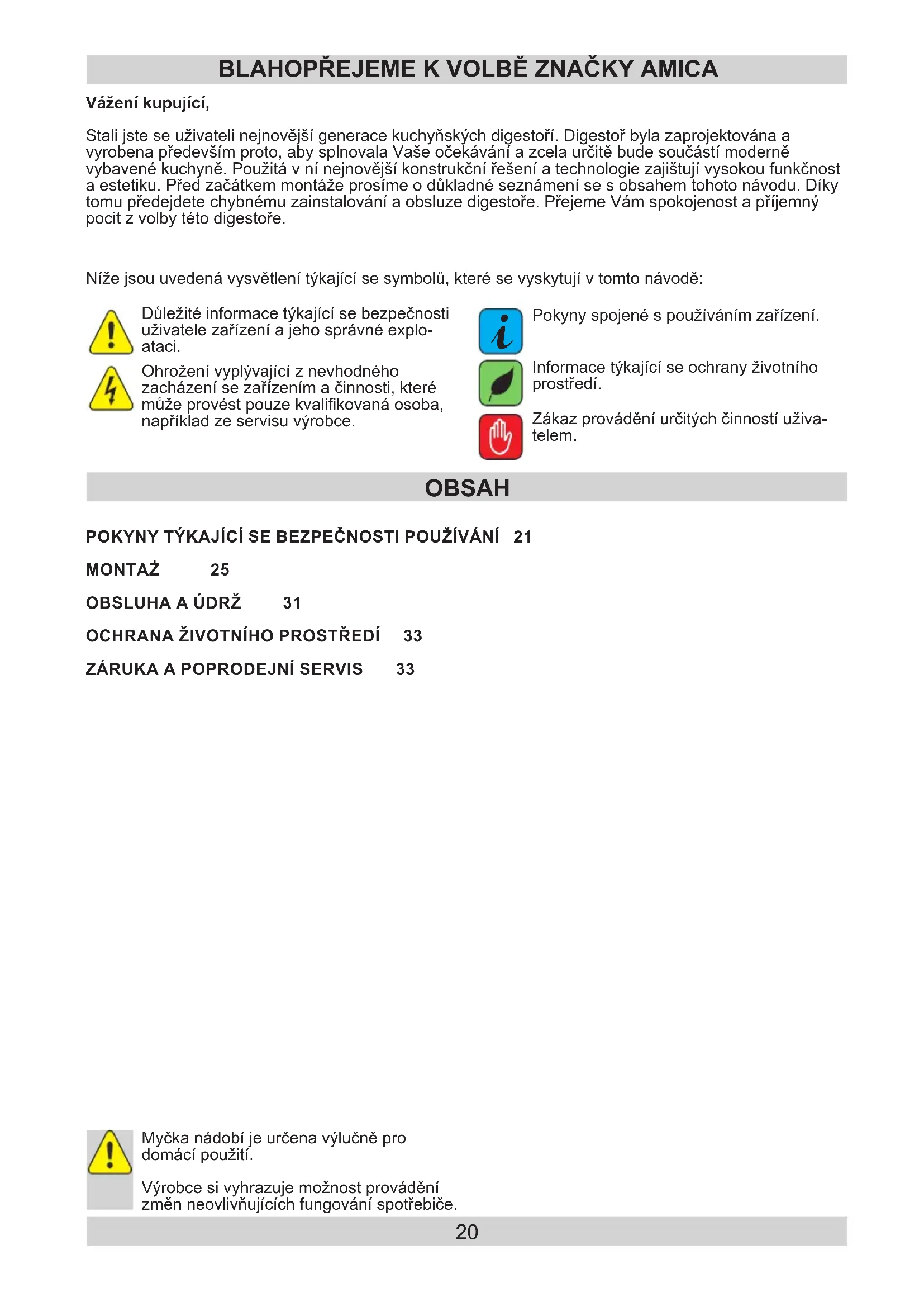 - dyrektywy RoHS 2011/65/UE i dlatego wyrób został oznakowany oraz została wystawiona dla niego deklaracja zgodności udostępniana organom nadzorującym rynek.20 OBSAH Vážení kupující, Stali jste se uživateli nejnovější generace kuchyňských digestoří. Digestoř byla zaprojektována a vyrobena především proto, aby splnovala Vaše očekávání a zcela určitě bude součástí moderně vybavené kuchyně. Použitá v ní nejnovější konstrukční řešení a technologie zajištují vysokou funkčnost a estetiku. Před začátkem montáže prosíme o důkladné seznámení se s obsahem tohoto návodu. Díky tomu předejdete chybnému zainstalování a obsluze digestoře. Přejeme Vám spokojenost a příjemný pocit z volby této digestoře. BLAHOPŘEJEME K VOLBĚ ZNAČKY AMICA POKYNY TÝKAJÍCÍ SE BEZPEČNOSTI POUŽÍVÁNÍ 21 MONTAŻ 25