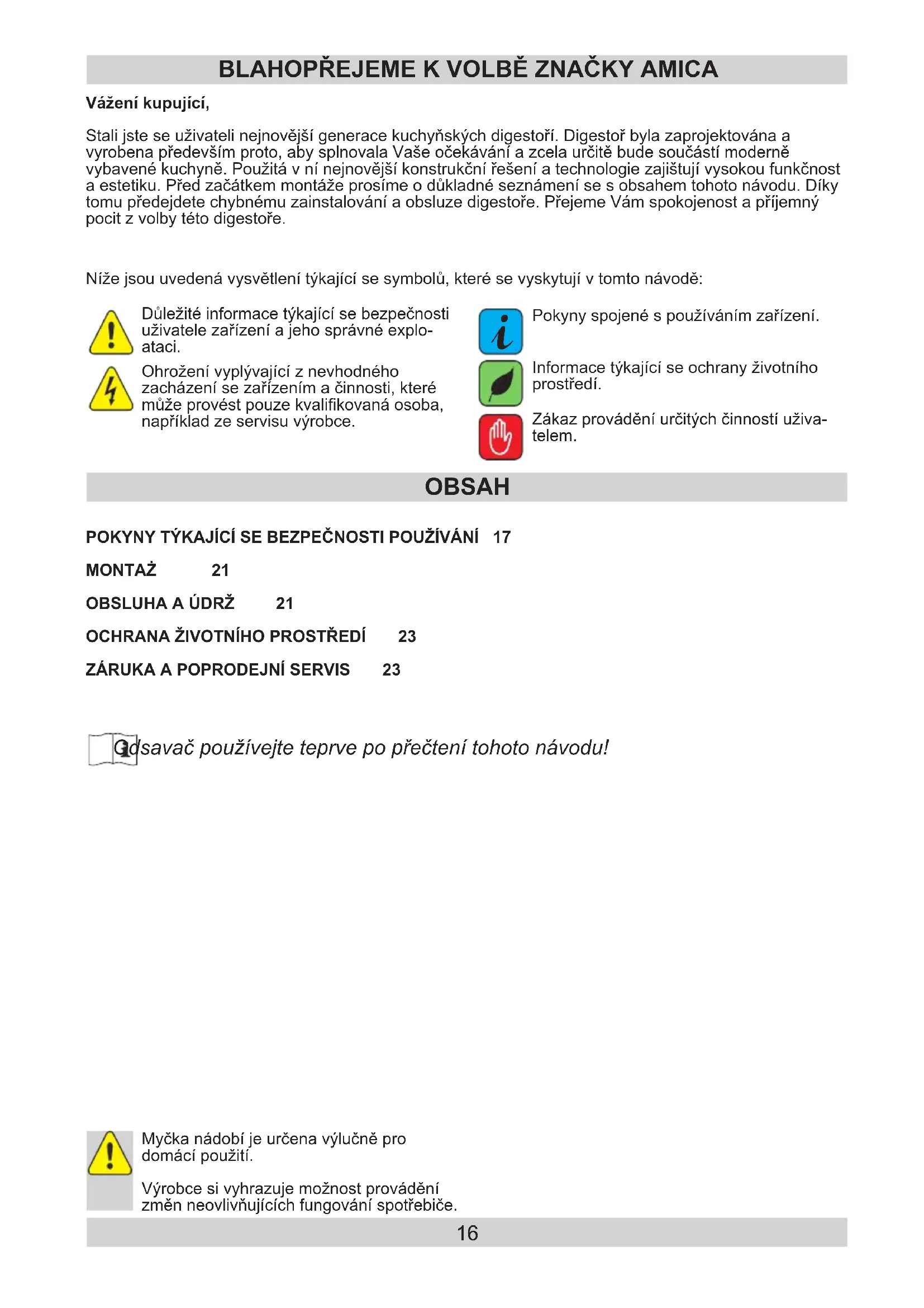 Informace týkající se ochrany životního prostředí. Myčka nádobí je určena výlučně pro domácí použití. Výrobce si vyhrazuje možnost provádění změn neovlivňujících fungování spotřebiče. Odsavačpoužívejteteprvepopřečtenítohotonávodu!17 POKYNY TÝKAJÍCÍ SE BEZPEČNOSTI POUŽÍVÁNÍ