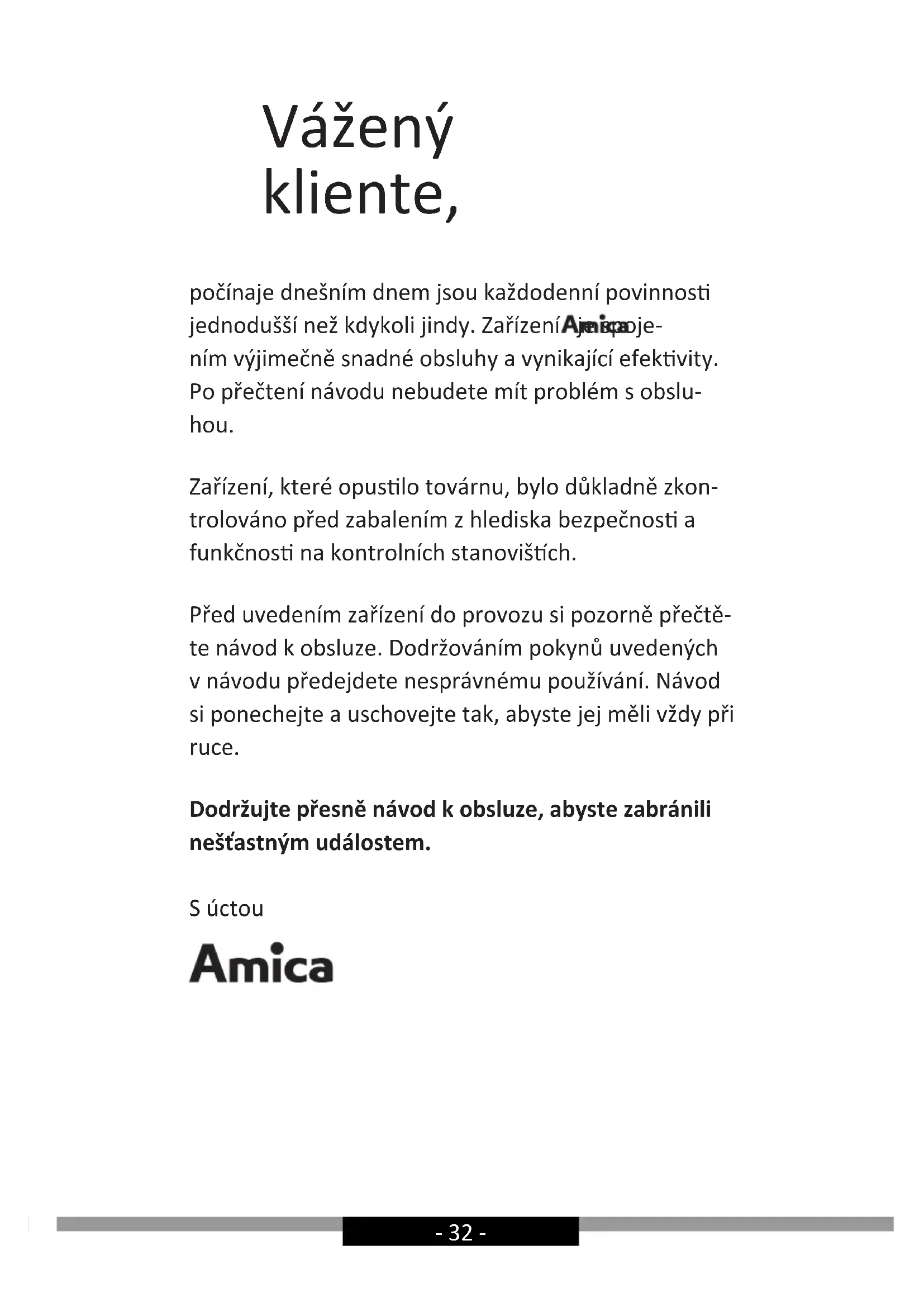 - dyrektywy niskonapięciowej 2014/35/UE• dyrektywy kompatybilności elek tro ma gne tycz nej 2014/30/UE• dyrektywy ekoprojektowania 2009/125/UE• dyrektywy RoHS 2011/65/UE i dlatego wyrób został oznakowany oraz została wystawiona dla niego deklaracja zgodności udostępniana organom nadzorującym rynek.- 32 - Vážený kliente, počínaje dnešním dnem jsou každodenní povinnos jednodušší než kdykoli jindy. Zařízení je spoje- ním výjimečně snadné obsluhy a vynikající efekvity. Po přečtení návodu nebudete mít problém s obslu- hou. Zařízení, které opuslo továrnu, bylo důkladně zkon- trolováno před zabalením z hlediska bezpečnos a funkčnos na kontrolních stanovišch. Před uvedením zařízení do provozu si pozorně přečtě- te návod k obsluze. Dodržováním pokynů uvedených v návodu předejdete nesprávnému používání. Návod si ponechejte a uschovejte tak, abyste jej měli vždy při ruce. Dodržujte přesně návod k obsluze, abyste zabránili nešťastným událostem. S úctou- 33 -