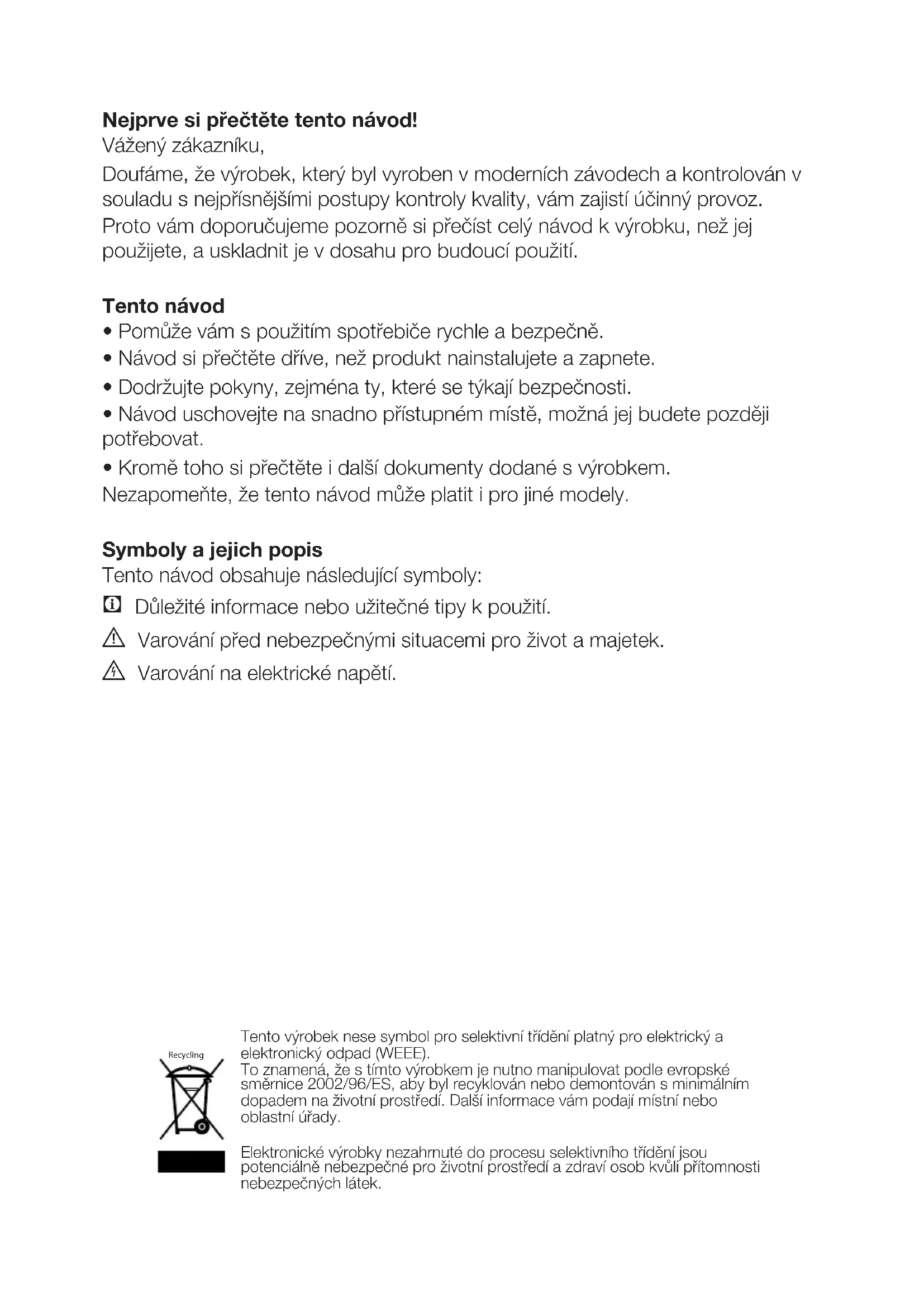 - Kromě toho si přečtěte i další dokumenty dodané s výrobkem. Nezapomeňte, že tento návod může platit i pro jiné modely. Symboly a jejich popis Tento návod obsahuje následující symboly: C Důležité informace nebo užitečné tipy k použití. A Varování před nebezpečnými situacemi pro život a majetek. B Varování na elektrické napětí. Tento výrobek nese symbol pro selektivní třídění platný pro elektrický a elektronický odpad (WEEE). To znamená, že s tímto výrobkem je nutno manipulovat podle evropské směrnice 2002/96/ES, aby byl recyklován nebo demontován s minimálním dopadem na životní prostředí. Další informace vám podají místní nebo oblastní úřady. Elektronické výrobky nezahrnuté do procesu selektivního třídění jsou potenciálně nebezpečné pro životní prostředí a zdraví osob kvůli přítomnosti nebezpečných látek. RecyclingCZ