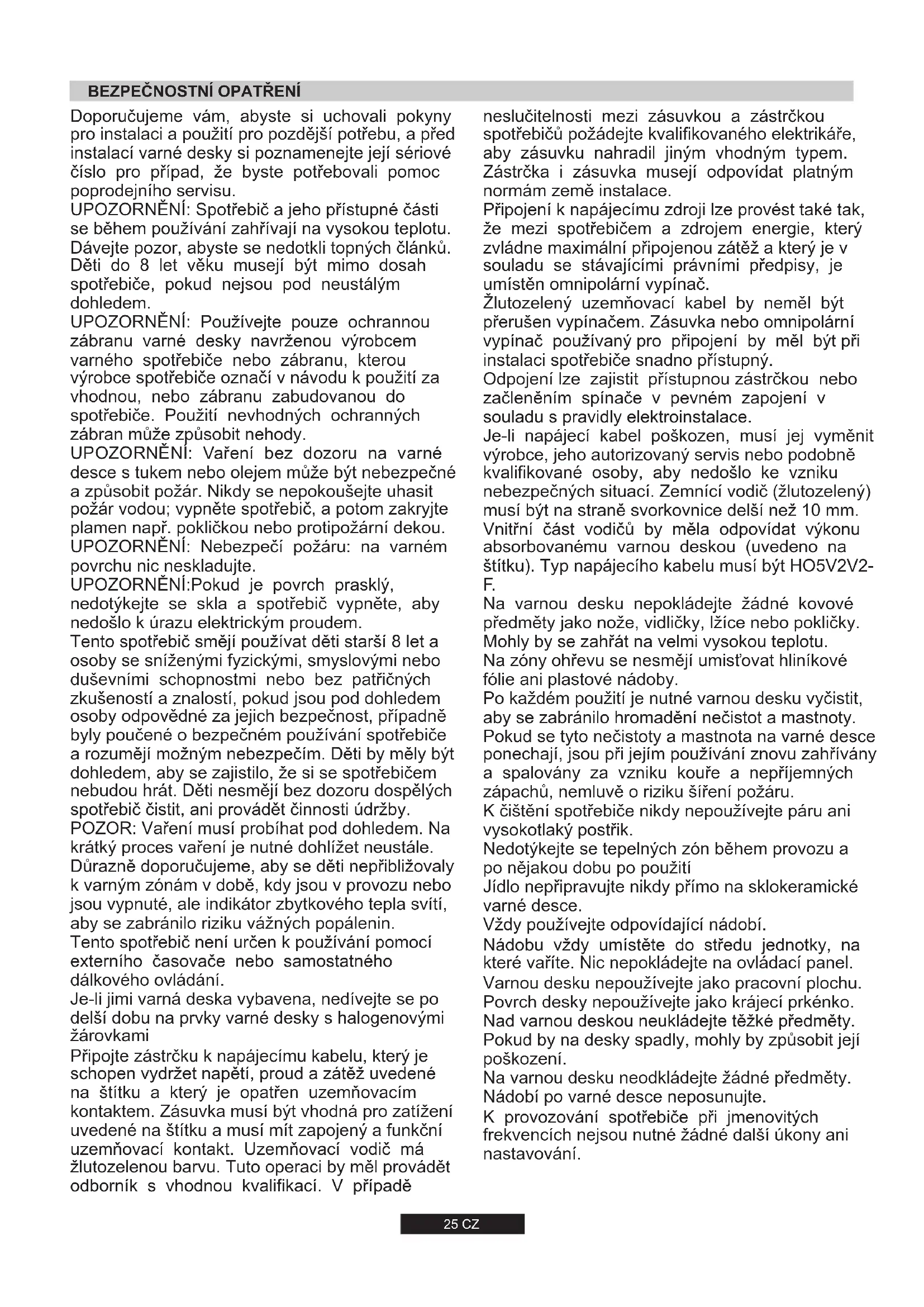 25 CZ Je-li napájecí kabel poškozen, musí jej vyměnit výrobce, jeho autorizovaný servis nebo podobně kvalifikované osoby, aby nedošlo ke vzniku nebezpečných situací. Zemnící vodič (žlutozelený) musí být na straně svorkovnice delší než 10 mm. Vnitřní část vodičů by měla odpovídat výkonu absorbovanému varnou deskou (uvedeno na štítku). Typ napájecího kabelu musí být HO5V2V2-
