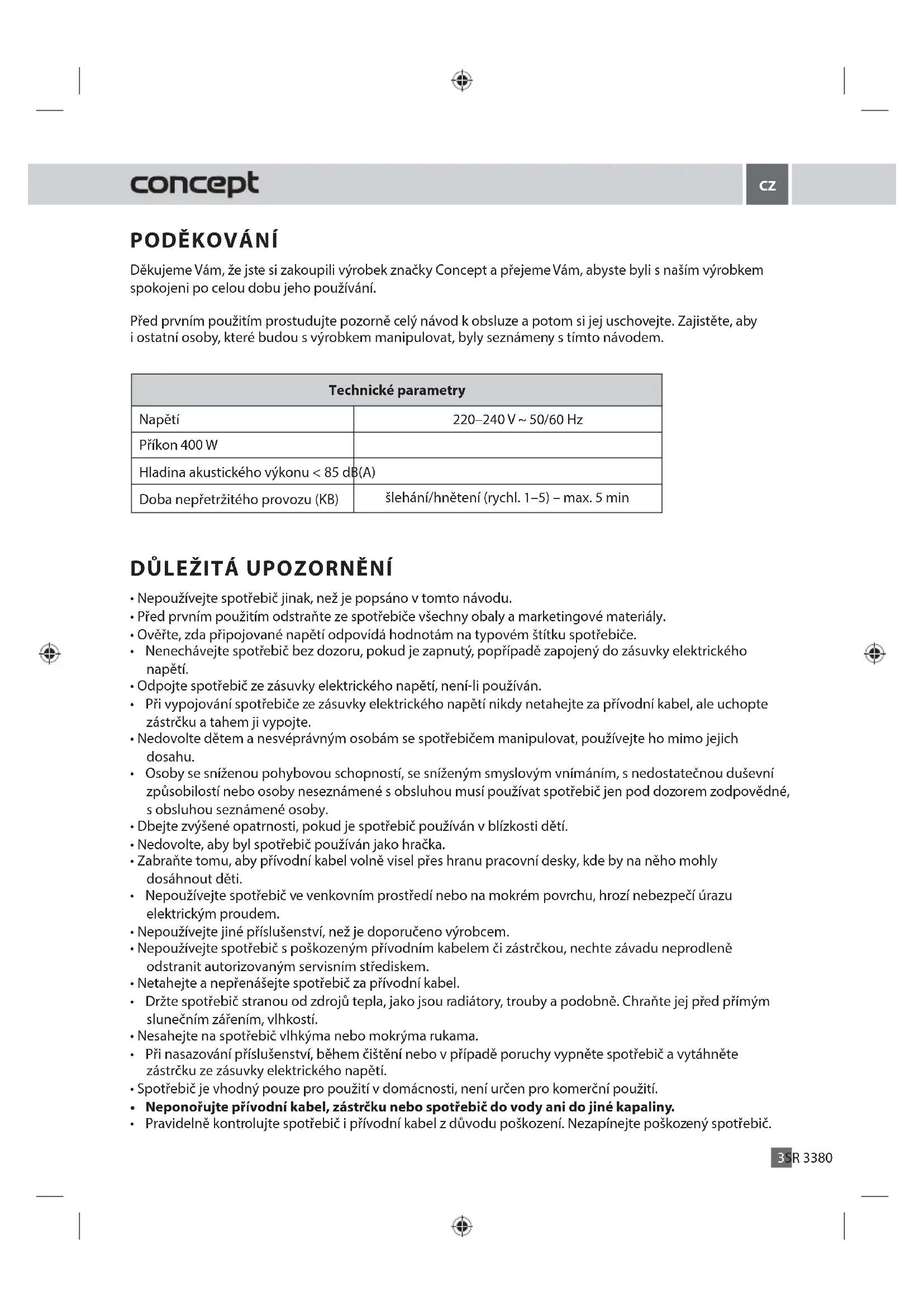 Recyklace spotřebiče na konci jeho životnosti Symbol na výrobku nebo jeho balení udává, že tento výrobek nepatří do domácího odpadu. Je nutné odvézt ho do sběrného místa pro recyklaci elektrického a elektronického zařízení. Zajištěním správné likvidace tohoto výroku pomůžete zabránit negativním důsledkům pro životní prostředí a lidské zdraví, které by jinak byly způsobeny nevhodnou likvidací tohoto výrobku. Podrobnější informace o recyklaci tohoto výrobku zjistíte u příslušného místního úřadu, služby pro likvidaci domovního odpadu nebo v obchodě, kde jste výrobek zakoupili. Tento výrobek splňuje veškeré základní požadavky směrnic EU, které se na něj vztahují. Změny v textu, designu a technických specifikací se mohou měnit bez předchozího upozornění a vyhrazujeme si právo na jejich změnu. SR 3380 Problém Příčina ŘešeníPOĎAKOVANIE Ďakujeme vám, že ste si kúpili výrobok značky Concept a prajeme vám, aby ste boli s naším výrobkom spo- kojní po celú dobu jeho používania. Pred prvým použitím si preštudujte pozorne celý návod na obsluhu a potom ho uschovajte. Zaistite, aby aj ostatné osoby, ktoré budú s výrobkom manipulovať, boli oboznámené s týmto návodom. Technické parametre Napätie 220–240 V ~ 50 /60 Hz Príkon 400 W Hladina akustického výkonu < 85 dB(A) Čas nepretržitej prevádzky (KB) šľahanie/hnietenie (rýchl. 1–5) – max. 5 min.