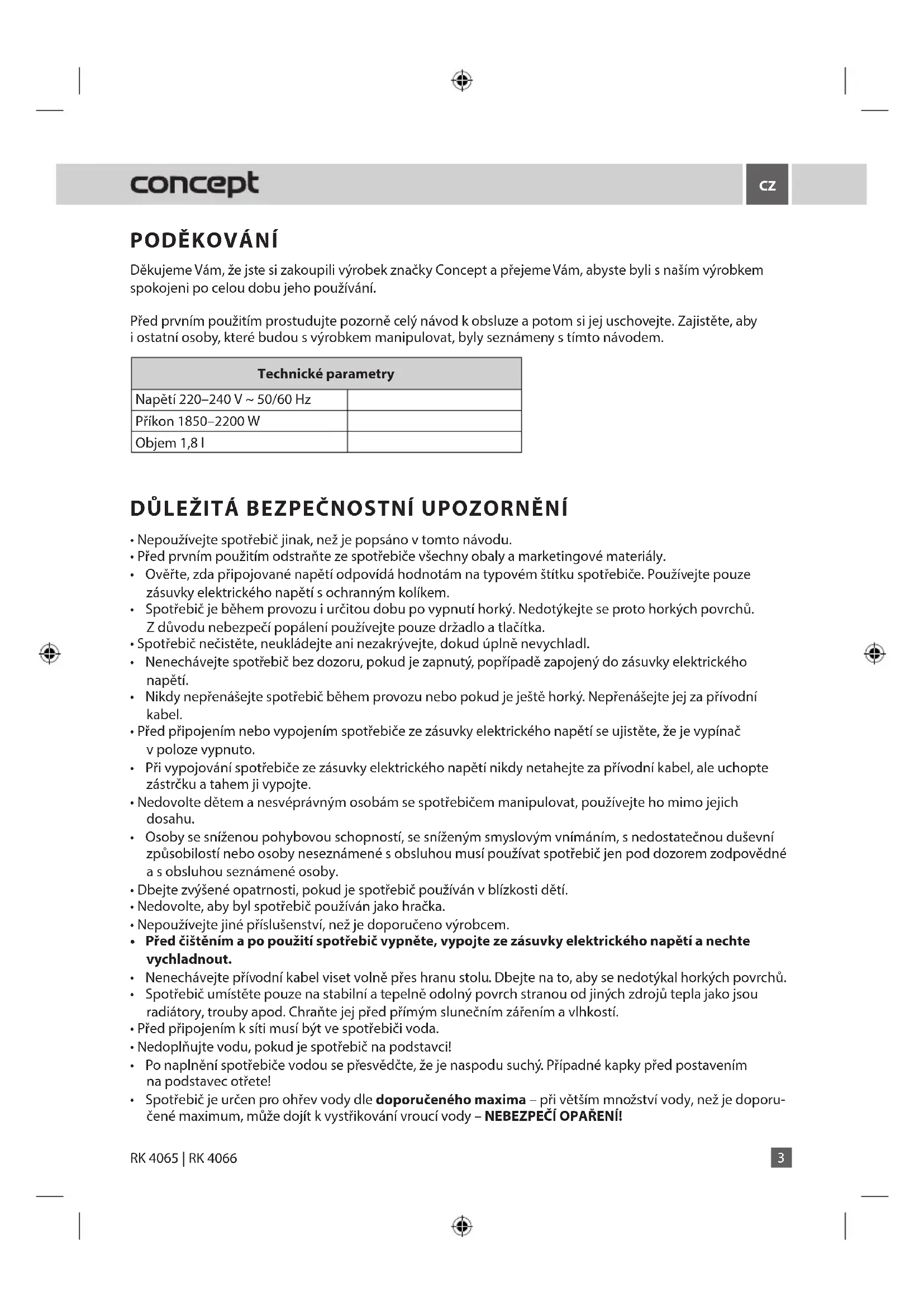 RK 4065 - Varná konvice Concept - Bezplatný návod k obsluze