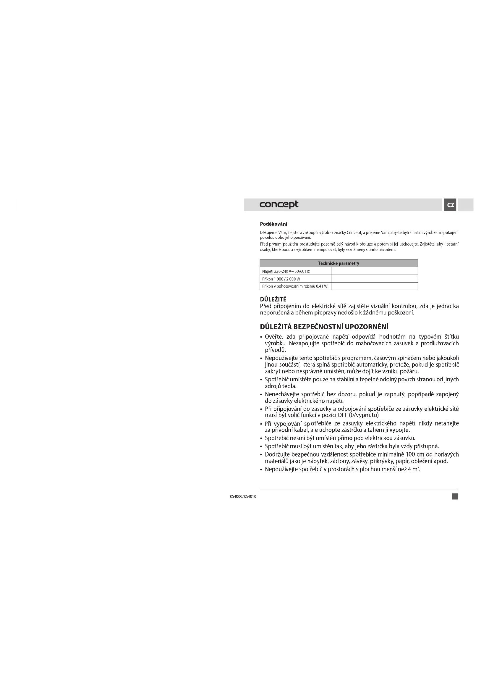 Konvektor skleněný Konvektor sklenený Konwektor szklany Üveg konvektor Stikla konvekcijas sildītājs KS4000 / KS4010 CZ SK PL HU LV EN DE FR IT ES Glass convector Glaskonvektor Convecteur en verre Convettore in vetro Convector de vidrio2 3 KS4000/KS4010 KS4000/KS4010 CZCZ Poděkování Děkujeme Vám, že jste si zakoupili výrobek značky Concept, a přejeme Vám, abyste byli s naším výrobkem spokojeni po celou dobu jeho používání. Před prvním použitím prostudujte pozorně celý návod k obsluze a potom si jej uschovejte. Zajistěte, aby i ostatní osoby, které budou s výrobkem manipulovat, byly seznámeny s tímto návodem. Technické parametry Napětí 220-240 V~ 50/60 Hz Příkon 1 000 / 2 000 W Příkon v pohotovostním režimu 0,41 W