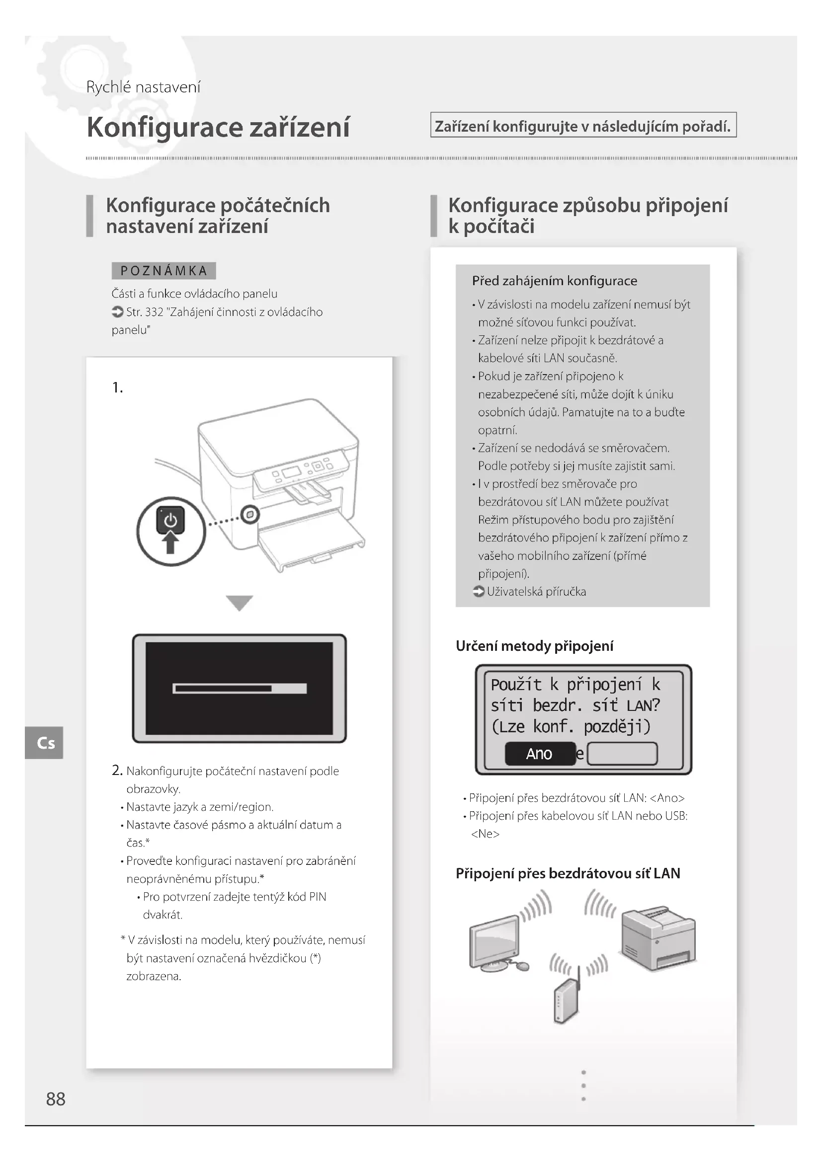 - Připojení přes bezdrátovou síť LAN: <Ano>• Připojení přes kabelovou síť LAN nebo USB: <Ne>Připojení přes bezdrátovou síť LANZařízení konfigurujte v následujícím pořadí.POZNÁMKAČásti a funkce ovládacího panelu Str. 332 "Zahájení činnosti z ovládacího panelu" Konfigurace počátečních nastavení zařízení Konfigurace způsobu připojení k počítači