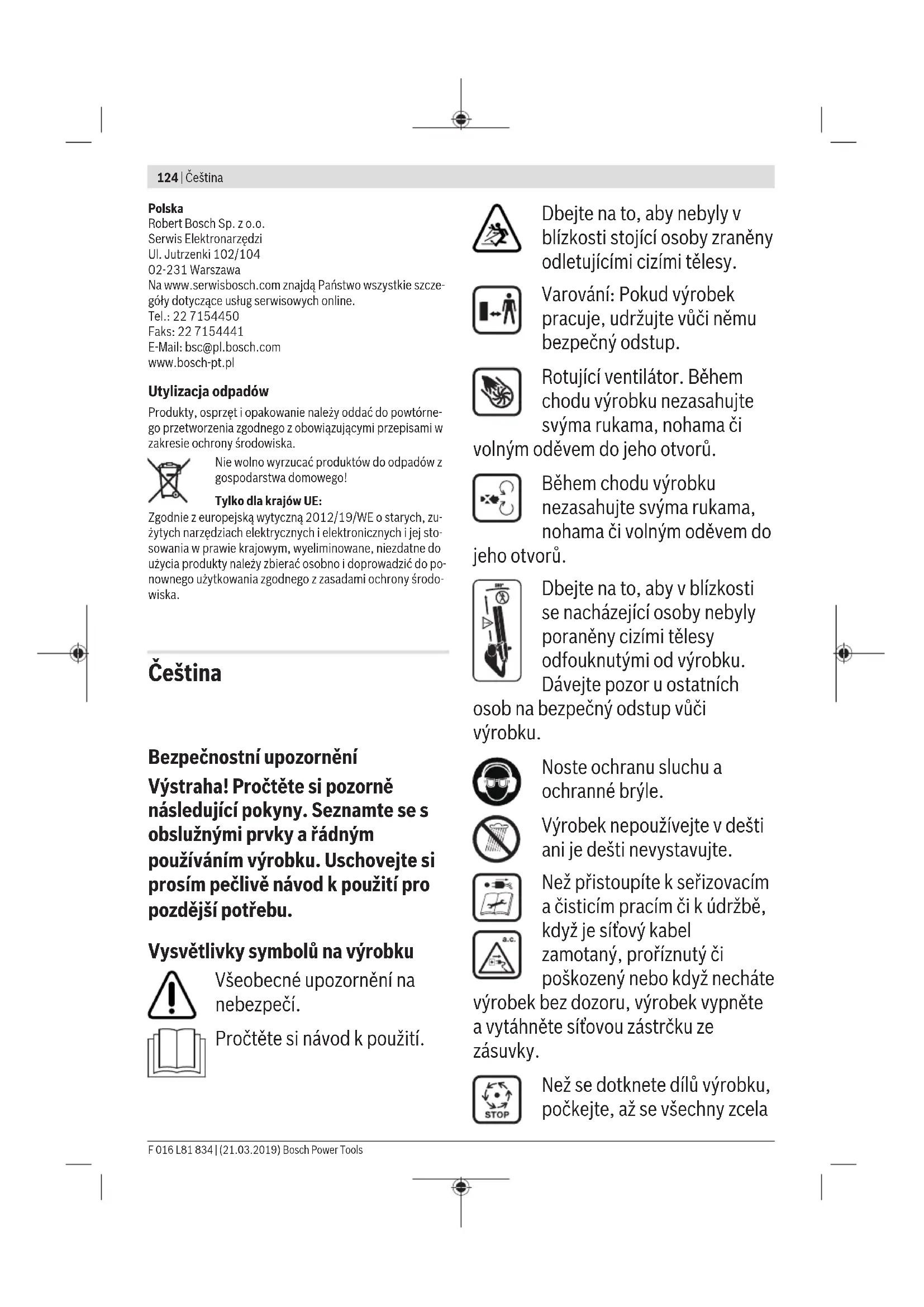 - Poskozeny ventilator cisplst (trisky, trhliny, vrypy) zvysujr iziko poraneni dané odmrstenymi cizimi telesy. Pokud jsou ventilator nebo plst poskozeny,kontaktujte horkou linku (Hotline) firmy Bosch.