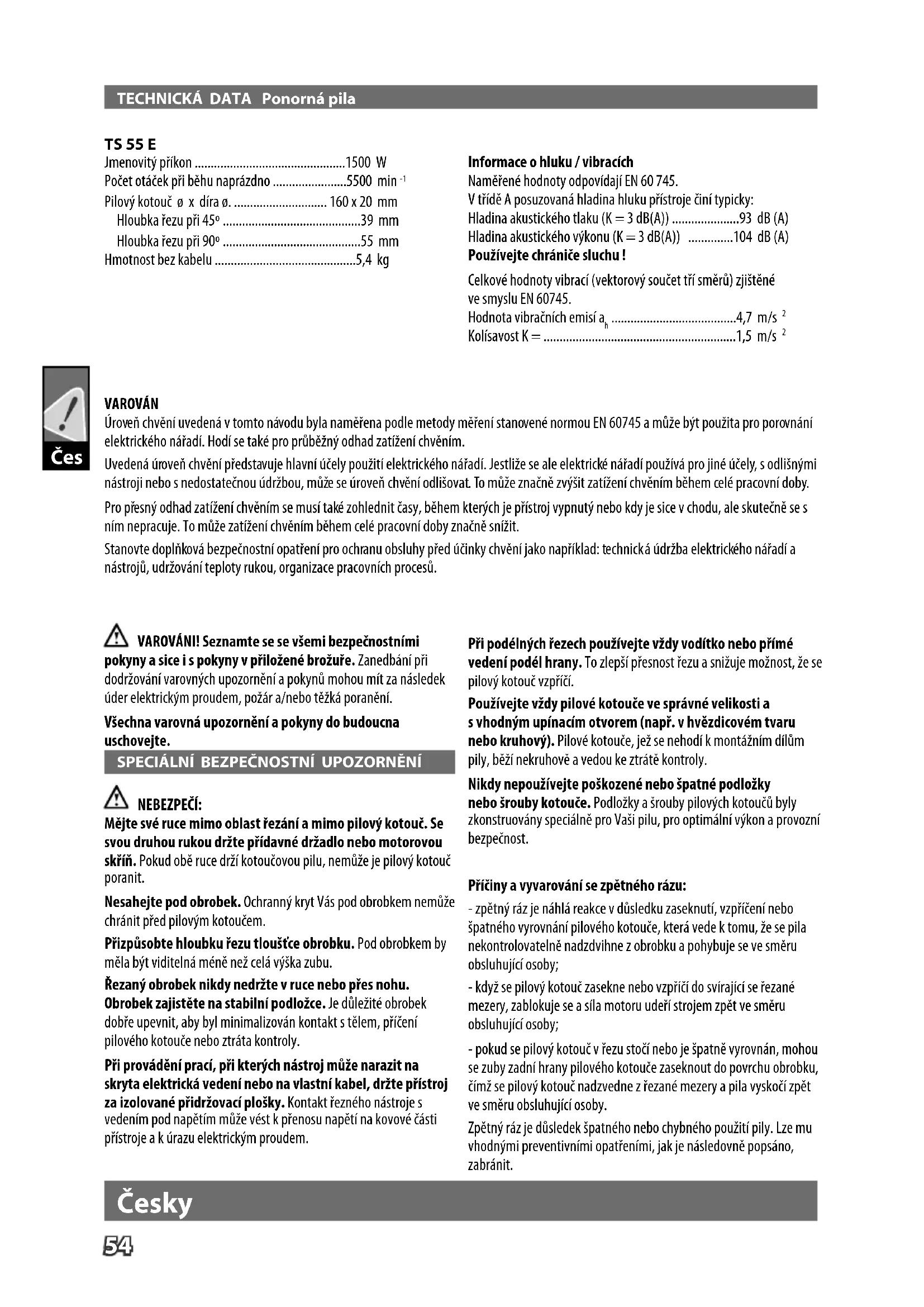 NEBEZPEČÍ: Mějte své ruce mimo oblast řezání a mimo pilový kotouč. Se svou druhou rukou držte přídavné držadlo nebo motorovou skříň. Pokud obě ruce drží kotoučovou pilu, nemůže je pilový kotouč poranit. Nesahejte pod obrobek. Ochranný kryt Vás pod obrobkem nemůže chránit před pilovým kotoučem. Přizpůsobte hloubku řezu tloušťce obrobku. Pod obrobkem by měla být viditelná méně než celá výška zubu. Řezaný obrobek nikdy nedržte vruce nebo přes nohu. Obrobek zajistěte na stabilní podložce. Je důležité obrobek dobře upevnit, aby byl minimalizován kontakt stělem, příčení pilového kotouče nebo ztráta kontroly. Při provádění prací, při kterých nástroj může narazit na skryta elektrická vedení nebo na vlastní kabel, držte přístroj za izolované přidržovací plošky. Kontakt řezného nástroje s vedením pod napětím může vést k přenosu napětí na kovové části přístroje a k úrazu elektrickým proudem. Při podélných řezech používejte vždy vodítko nebo přímé vedení podél hrany. To zlepší přesnost řezu a snižuje možnost, že se pilový kotouč vzpříčí. Používejte vždy pilové kotouče ve správné velikosti a svhodným upínacím otvorem (např. v hvězdicovém tvaru nebo kruhový). Pilové kotouče, jež se nehodí kmontážním dílům pily, běží nekruhově a vedou ke ztrátě kontroly. Nikdy nepoužívejte poškozené nebo špatné podložky nebo šrouby kotouče. Podložky a šrouby pilových kotoučů byly zkonstruovány speciálně pro Vaši pilu, pro optimální výkon a provozní bezpečnost. Příčiny a vyvarování se zpětného rázu: - zpětný ráz je náhlá reakce v důsledku zaseknutí, vzpříčení nebo špatného vyrovnání pilového kotouče, která vede k tomu, že se pila nekontrolovatelně nadzdvihne z obrobku a pohybuje se ve směru obsluhující osoby; - když se pilový kotouč zasekne nebo vzpříčí do svírající se řezané mezery, zablokuje se a síla motoru udeří strojem zpět ve směru obsluhující osoby; - pokud se pilový kotouč v řezu stočí nebo je špatně vyrovnán, mohou se zuby zadní hrany pilového kotouče zaseknout do povrchu obrobku, čímž se pilový kotouč nadzvedne zřezané mezery a pila vyskočí zpět ve směru obsluhující osoby. Zpětný ráz je důsledek špatného nebo chybného použití pily. Lze mu vhodnými preventivními opatřeními, jak je následovně popsáno, zabránit. VAROVÁN Úroveň chvění uvedená v tomto návodu byla naměřena podle metody měření stanovené normou EN 60745 a může být použita pro porovnání elektrického nářadí. Hodí se také pro průběžný odhad zatížení chvěním. Uvedená úroveň chvění představuje hlavní účely použití elektrického nářadí. Jestliže se ale elektrické nářadí používá pro jiné účely, s odlišnými nástroji nebo s nedostatečnou údržbou, může se úroveň chvění odlišovat. To může značně zvýšit zatížení chvěním během celé pracovní doby. Pro přesný odhad zatížení chvěním se musí také zohlednit časy, během kterých je přístroj vypnutý nebo kdy je sice v chodu, ale skutečně se s ním nepracuje. To může zatížení chvěním během celé pracovní doby značně snížit. Stanovte doplňková bezpečnostní opatření pro ochranu obsluhy před účinky chvění jako například: technická údržba elektrického nářadí a nástrojů, udržování teploty rukou, organizace pracovních procesů. TS 55 E Jmenovitý příkon ...............................................1500 W Počet otáček při běhu naprázdno .......................5500 min