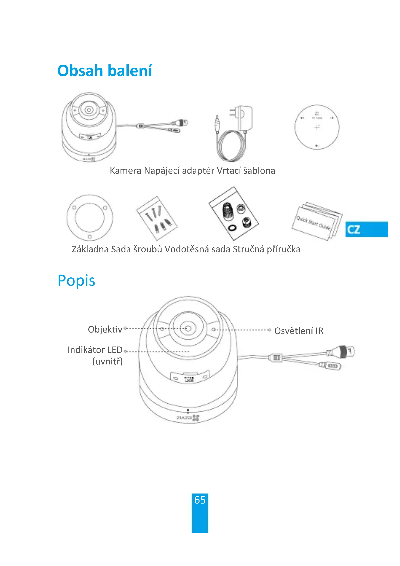 Γυρίστε την κάμερα όπως φαίνεται στην εικόνα. Για περισσότερες πληροφορίες, ανατρέξτε στη διεύθυνση www.ezvizlife.com.65 Kamera Napájecí adaptér Vrtací šablona Základna Sada šroubů Vodotěsná sada Stručná příručka Popis Indikátor LED (uvnitř) Osvětlení IR Objekv Obsah balení66 Tlačítko RESETOVAT Slot karty microSD Síťové rozhraní Napájecí konektor Název Popis Osvětlení IR Osvětlení IR se zapne automacky při špatných světelných podmínkách, a zajis tak zřetelnější obraz. Indikátor LED • Nepřerušovaná červená: Kamera se spouš.