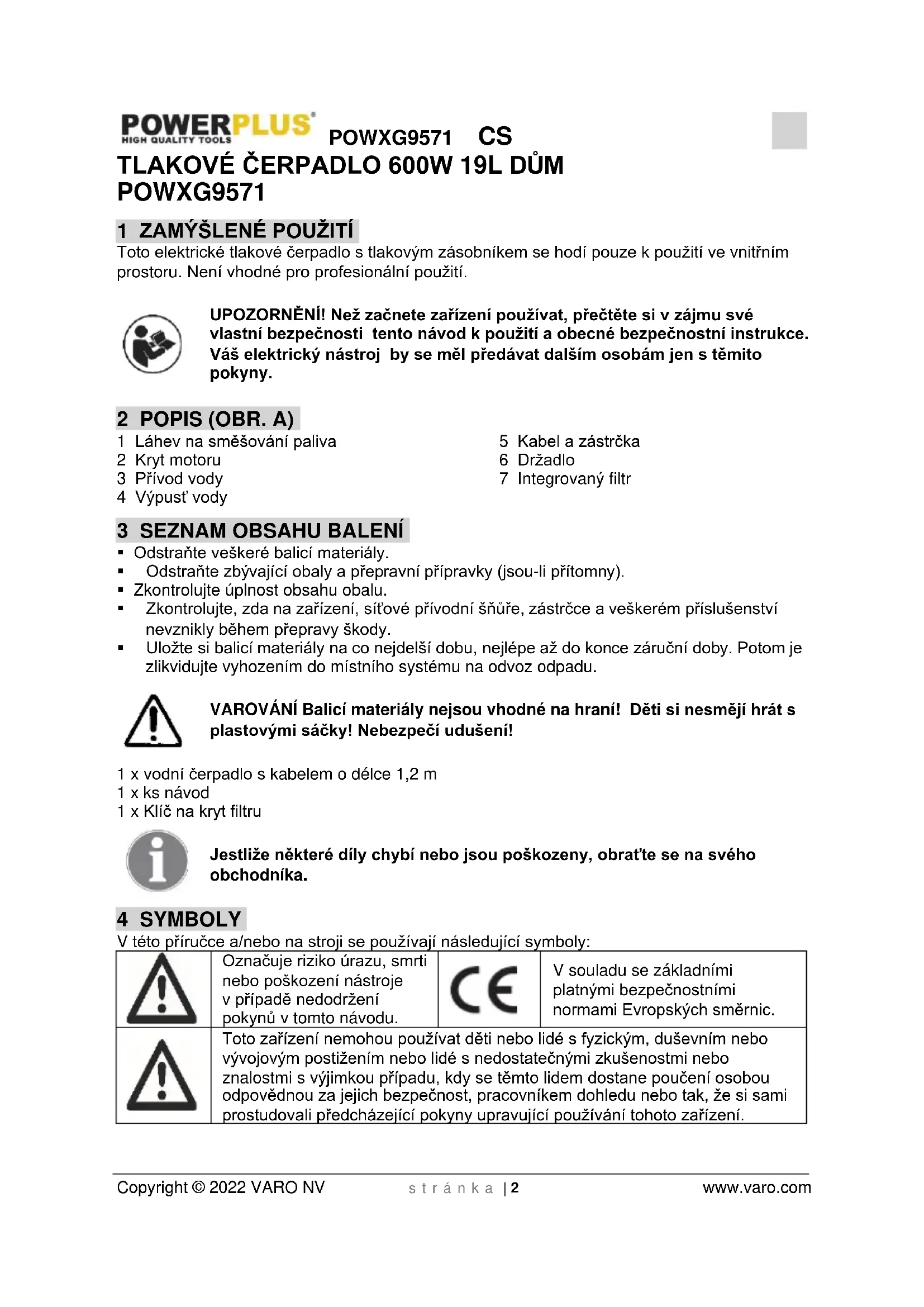 - Čas od času vyčistěte komory čerpadla vypláchnutím čistou vodou tak, aby nebyly zaneseny nečistotami.POWXG9571 CS Copyright © 2022 VARO NV s t r á n k a | 5 www.varo.com