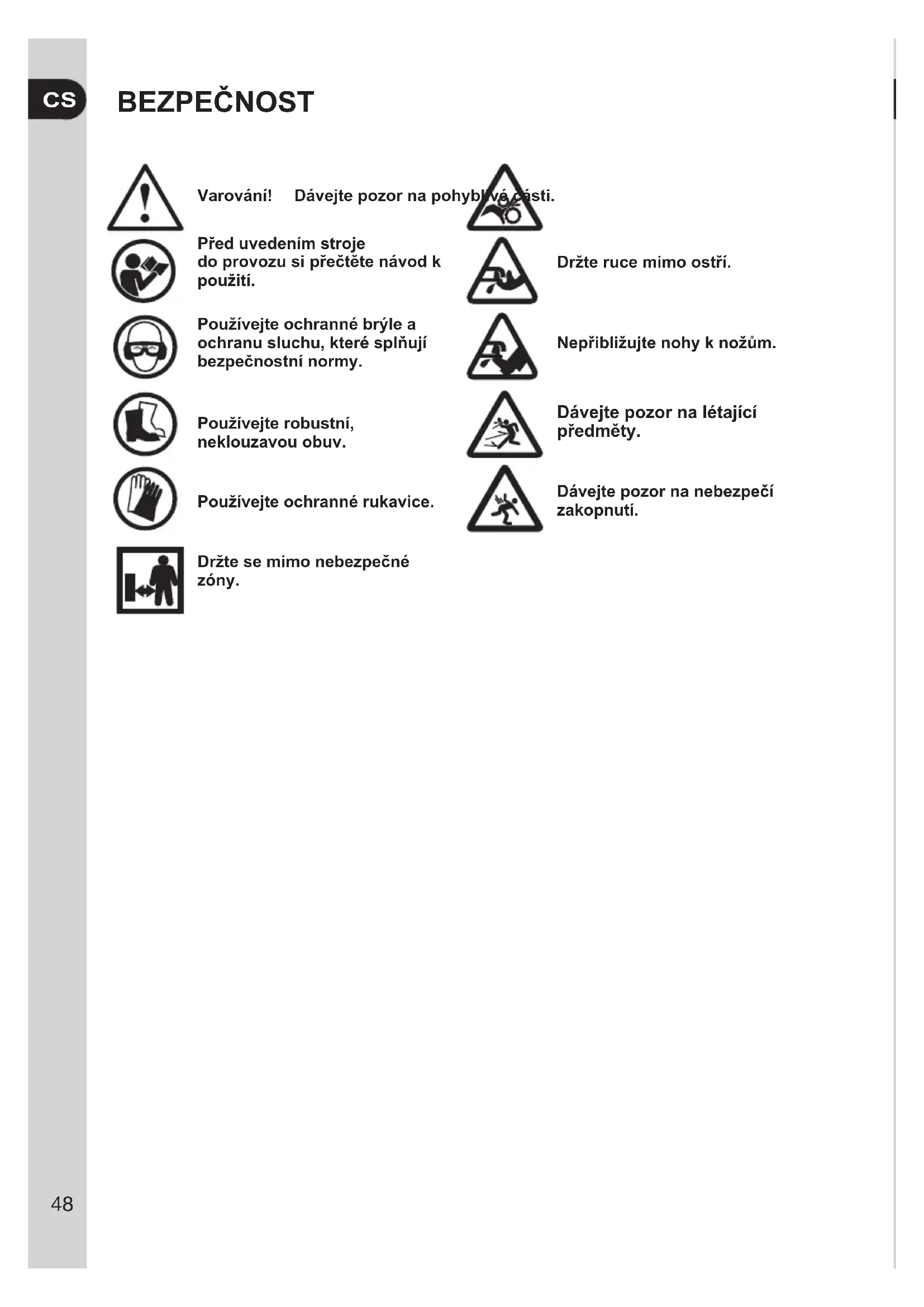 Bezpečnost 48 Montáž 49 Provoz 50 Údržba 50BEZPEČNOST Varování! Dávejtepozornapohyblivéčásti. Předuvedenímstroje doprovozusi přečtětenávodk použití. Držterucemimoostří. Používejteochrannébrýlea ochranusluchu,kterésplňují bezpečnostnínormy. Nepřibližujtenohyknožům. Používejterobustní, neklouzavouobuv. Dávejtepozornalétající předměty. Používejteochrannérukavice. Dávejtepozornanebezpečí zakopnutí. Držtesemimonebezpečné zóny.