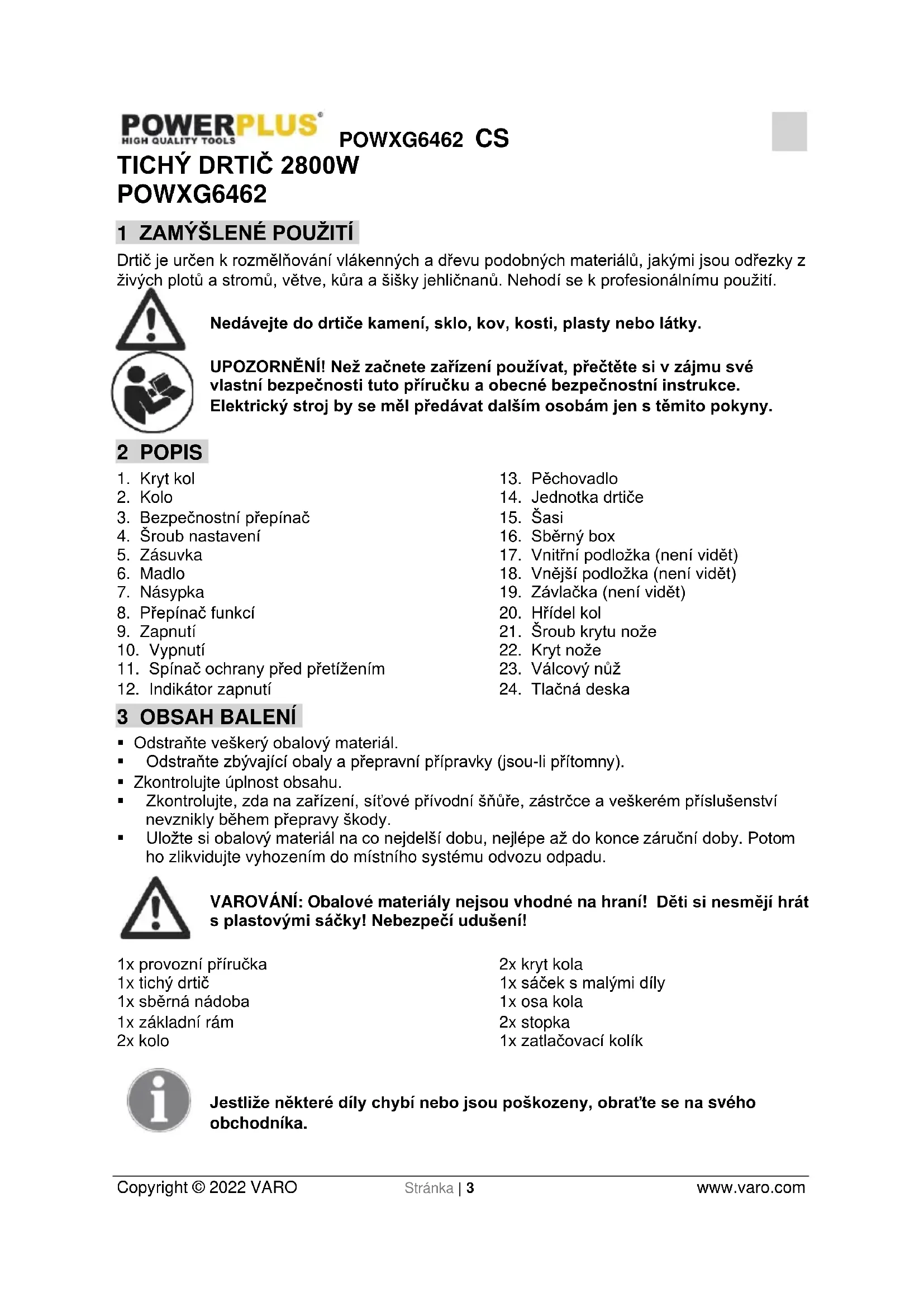 - Nedovolte, aby drtič obsluhovaly děti nebo osoby, které si nepřečetly tento návod k použití nebo které nejsou s drtičem obeznámeny.POWXG6462 CS Copyright © 2022 VARO Stránka | 7 www.varo.com