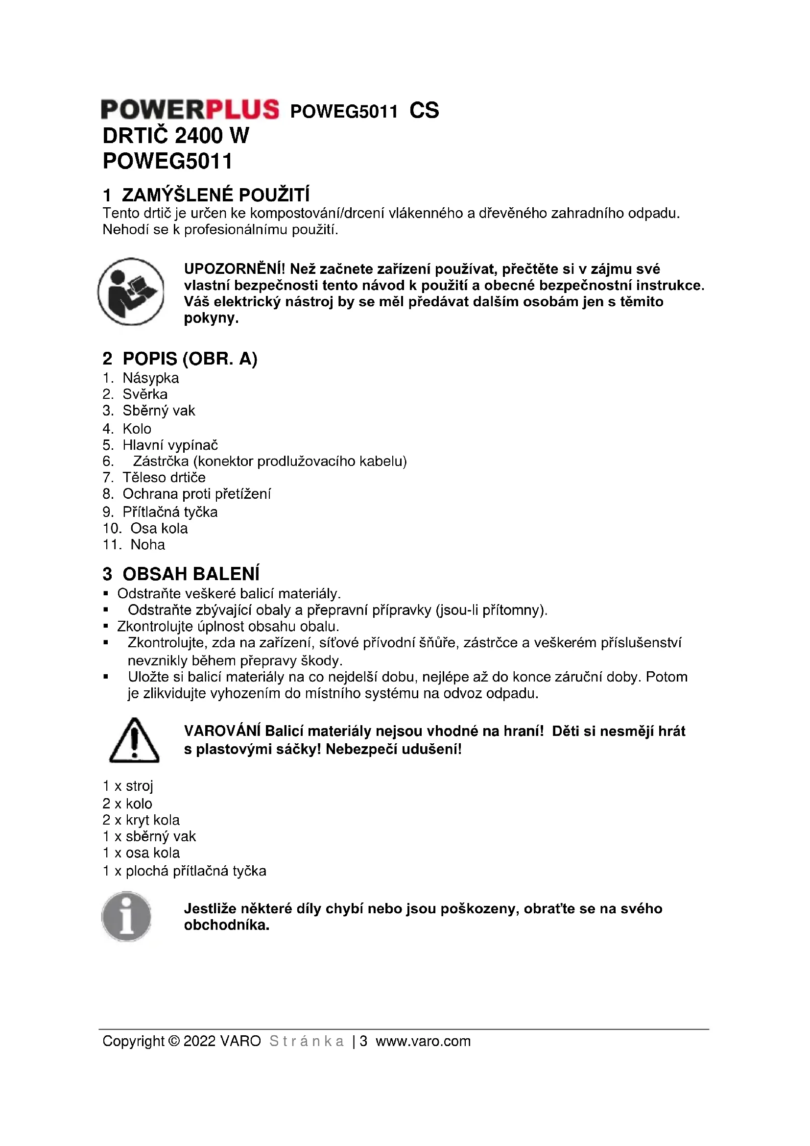 - Před použitím musí být drtič správně sestaven. Varování! Toto zařízení musí být uzemněno! Varování! Používejte pouze prodlužovací šňůry se zapojeným zemnicím vodičem.POWEG5011 CS Copyright © 2022 VARO S t r á n k a | 7 www.varo.com
