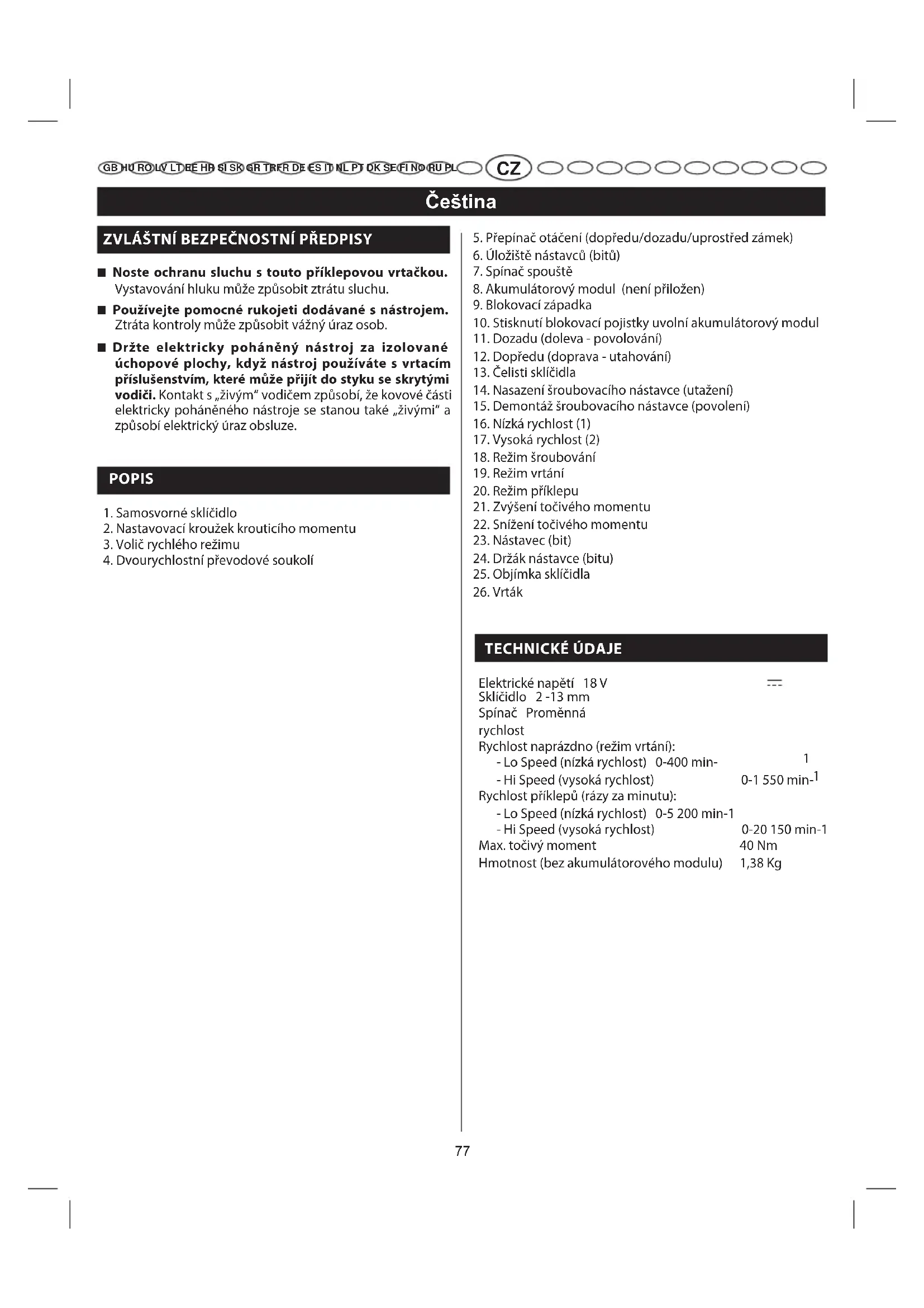 Rychlost příklepů (rázy za minutu): - Lo Speed (nízká rychlost) 0-5 200 min-1 - Hi Speed (vysoká rychlost) 0-20 150 min-1 Max. točivý moment 40 Nm Hmotnost (bez akumulátorového modulu) 1,38 Kg78 Čeština