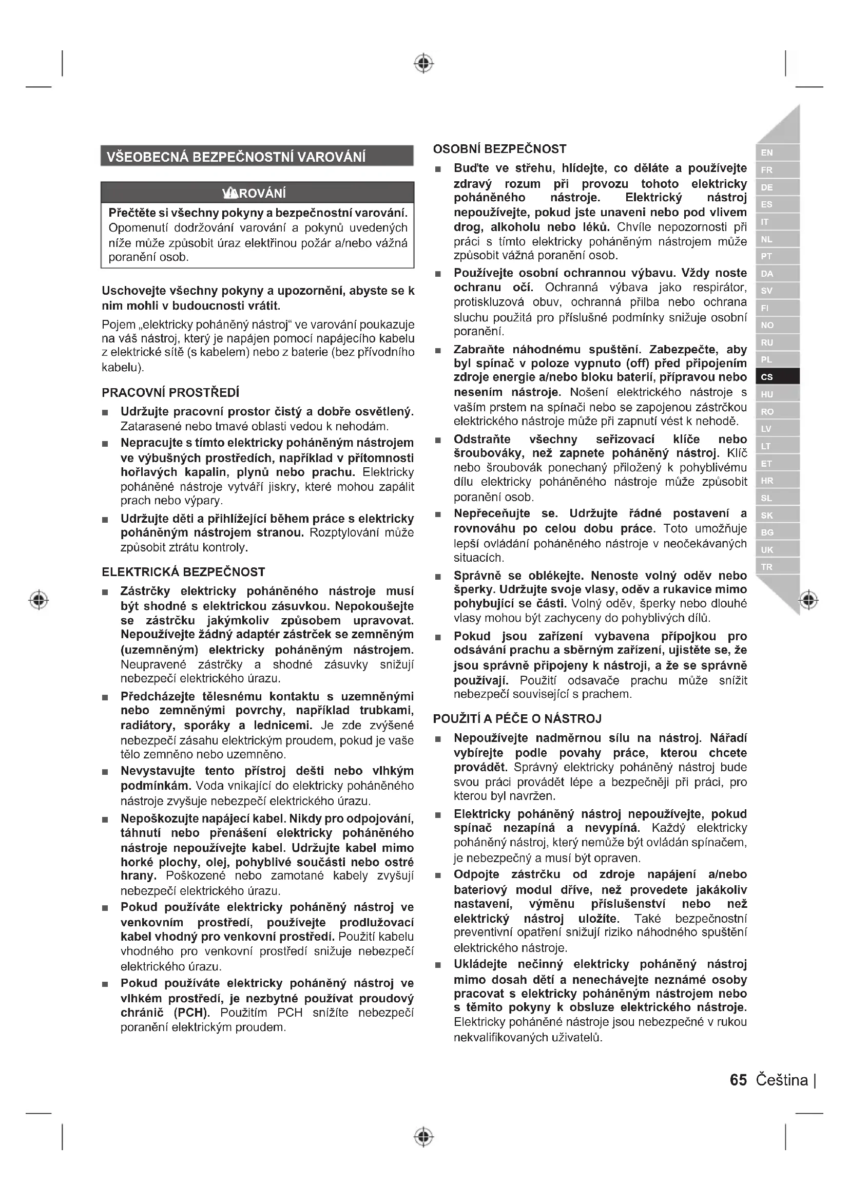 VAROVÁNÍ Přečtěte si všechny pokyny a bezpečnostní varování. Opomenutí dodržování varování a pokynů uvedených níže může způsobit úraz elektřinou požár a/nebo vážná poranění osob. Uschovejte všechny pokyny a upozornění, abyste se k nim mohli v budoucnosti vrátit. Pojem „elektricky poháněný nástroj“ ve varování poukazuje na váš nástroj, který je napájen pomocí napájecího kabelu z elektrické sítě (s kabelem) nebo z baterie (bez přívodního kabelu).
