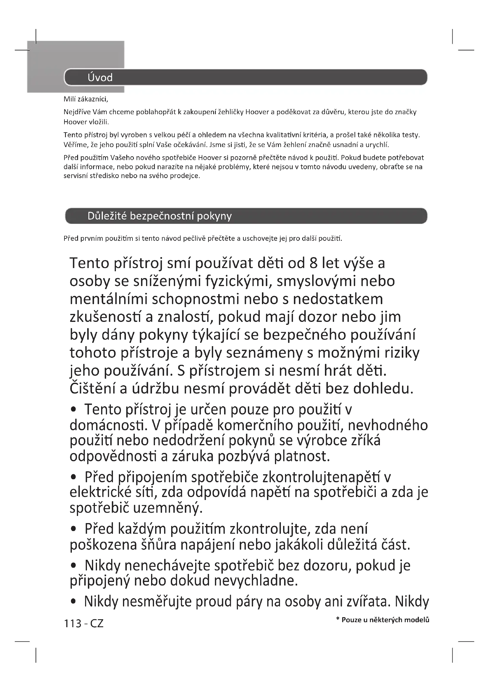 - Pouze u některých modelů Úvod Milí zákazníci, Nejdříve Vám chceme poblahopřát k zakoupení žehličky Hoover a poděkovat za důvěru, kterou jste do značky Hoover vložili. Tento přístroj byl vyroben s velkou péčí a ohledem na všechna kvalitavní kritéria, a prošel také několika testy. Věříme, že jeho použi splní Vaše očekávání. Jsme si jis, že se Vám žehlení značně usnadní a urychlí. Před použim Vašeho nového spotřebiče Hoover si pozorně přečtěte návod k použi. Pokud budete potřebovat další informace, nebo pokud narazíte na nějaké problémy, které nejsou v tomto návodu uvedeny, obraťte se na servisní středisko nebo na svého prodejce. Důležité bezpečnostní pokyny Před prvním použim si tento návod pečlivě přečtěte a uschovejte jej pro další použi. Tento přístroj smí používat dě od 8 let výše a osoby se sníženými fyzickými, smyslovými nebo mentálními schopnostmi nebo s nedostatkem zkušenos a znalos, pokud mají dozor nebo jim byly dány pokyny týkající se bezpečného používání tohoto přístroje a byly seznámeny s možnými riziky jeho používání. S přístrojem si nesmí hrát dě. Čištění a údržbu nesmí provádět dě bez dohledu.