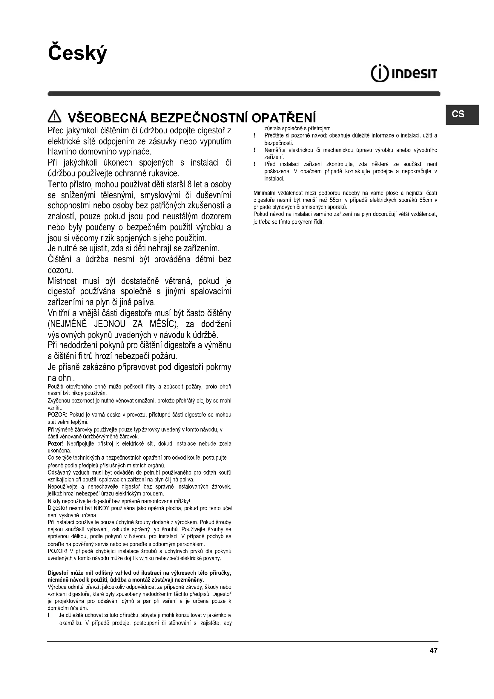 Před jakýmkoli čištěním či údržbou odpojte digestoř z elektrické sítě odpojením ze zásuvky nebo vypnutím hlavního domovního vypínače. Při jakýchkoli úkonech spojených s instalací či údržbou používejte ochranné rukavice. Tento přístroj mohou používat děti starší 8 let a osoby se sníženými tělesnými, smyslovými či duševními schopnostmi nebo osoby bez patřičných zkušeností a znalostí, pouze pokud jsou pod neustálým dozorem nebo byly poučeny o bezpečném použití výrobku a jsou si vědomy rizik spojených s jeho použitím. Je nutné se ujistit, zda si děti nehrají se zařízením. Čištění a údržba nesmí být prováděna dětmi bez dozoru. Místnost musí být dostatečně větraná, pokud je digestoř používána společně s jinými spalovacími zařízeními na plyn či jiná paliva. Vnitřní a vnější části digestoře musí být často čištěny (NEJMÉNĚ JEDNOU ZA MĚSÍC), za dodržení výslovných pokynů uvedených v návodu k údržbě. Při nedodržení pokynů pro čištění digestoře a výměnu a čištění filtrů hrozí nebezpečí požáru. Je přísně zakázáno připravovat pod digestoří pokrmy na ohni. Použití otevřeného ohně může poškodit filtry a způsobit požáry, proto oheň nesmí být nikdy používán. Zvýšenou pozornost je nutné věnovat smažení, protože přehřátý olej by se mohl vznítit. POZOR: Pokud je varná deska v provozu, přístupné části digestoře se mohou stát velmi teplými. Při výměně žárovky používejte pouze typ žárovky uvedený v tomto návodu, v části věnované údržbě/výměně žárovek. Pozor! Nepřipojujte přístroj k elektrické síti, dokud instalace nebude zcela ukončena. Co se týče technických a bezpečnostních opatření pro odvod kouře, postupujte přesně podle předpisů příslušných místních orgánů. Odsávaný vzduch musí být odváděn do potrubí používaného pro odtah kouřů vznikajících při použití spalovacích zařízení na plyn či jiná paliva. Nepoužívejte a nenechávejte digestoř bez správně instalovaných žárovek, jelikož hrozí nebezpečí úrazu elektrickým proudem. Nikdy nepoužívejte digestoř bez správně namontované mřížky! Digesto ř nesmí být NIKDY používána jako opěrná plocha, pokud pro tento účel není výslovně určena. Při instalaci používejte pouze úchytné šrouby dodané z výrobkem. Pokud šrouby nejsou součástí vybavení, zakupte správný typ šroubů. Používejte šrouby se správnou délkou, podle pokynů v Návodu pro instalaci. V případě pochyb se obraťte na pověřený servis nebo se poraďte s odborným personálem. POZOR! V případě chybějící instalace šroubů a úchytných prvků dle pokynů uvedených v tomto návodu může dojít k vzniku nebezpečí elektrické povahy. Digestoř může mít odlišný vzhled od ilustrací na výkresech této příručky, nicméně návod k použití, údržba a montáž zůstávají nezměněny. Výrobce odmítá převzít jakoukoliv odpovědnost za případné závady, škody nebo vznícení digestoře, které byly způsobeny nedodržením těchto předpisů. Digestoř je projektována pro odsávání dýmů a par při vaření a je určena pouze k domácím účel ům. ! Je důležité uchovat si tuto příručku, abyste ji mohli konzultovat v jakémkoliv okamžiku. V případě prodeje, postoupení či stěhování si zajistěte, aby zůstala společně s přístrojem. ! Přečtěte si pozorně návod: obsahuje důležité informace o instalaci, užití a bezpečnosti. ! Neměňte elektrickou či mechanickou úpravu výrobku anebo vývodního zařízení. ! Před instalací zařízení zkontrolujte, zda některá ze součástí není poškozena. V opačném případě kontaktujte prodejce a nepokračujte v instalaci. Minimální vzdálenost mezi podporou nádoby na varné ploše a nejnižší částí digestoře nesmí být menší než 55cm v případě elektrických sporáků 65cm v případě plynových či smíšených sporáků. Pokud návod na instalaci varného zařízení na plyn doporučují v ětší vzdálenost, je třeba se tímto pokynem řídit.48