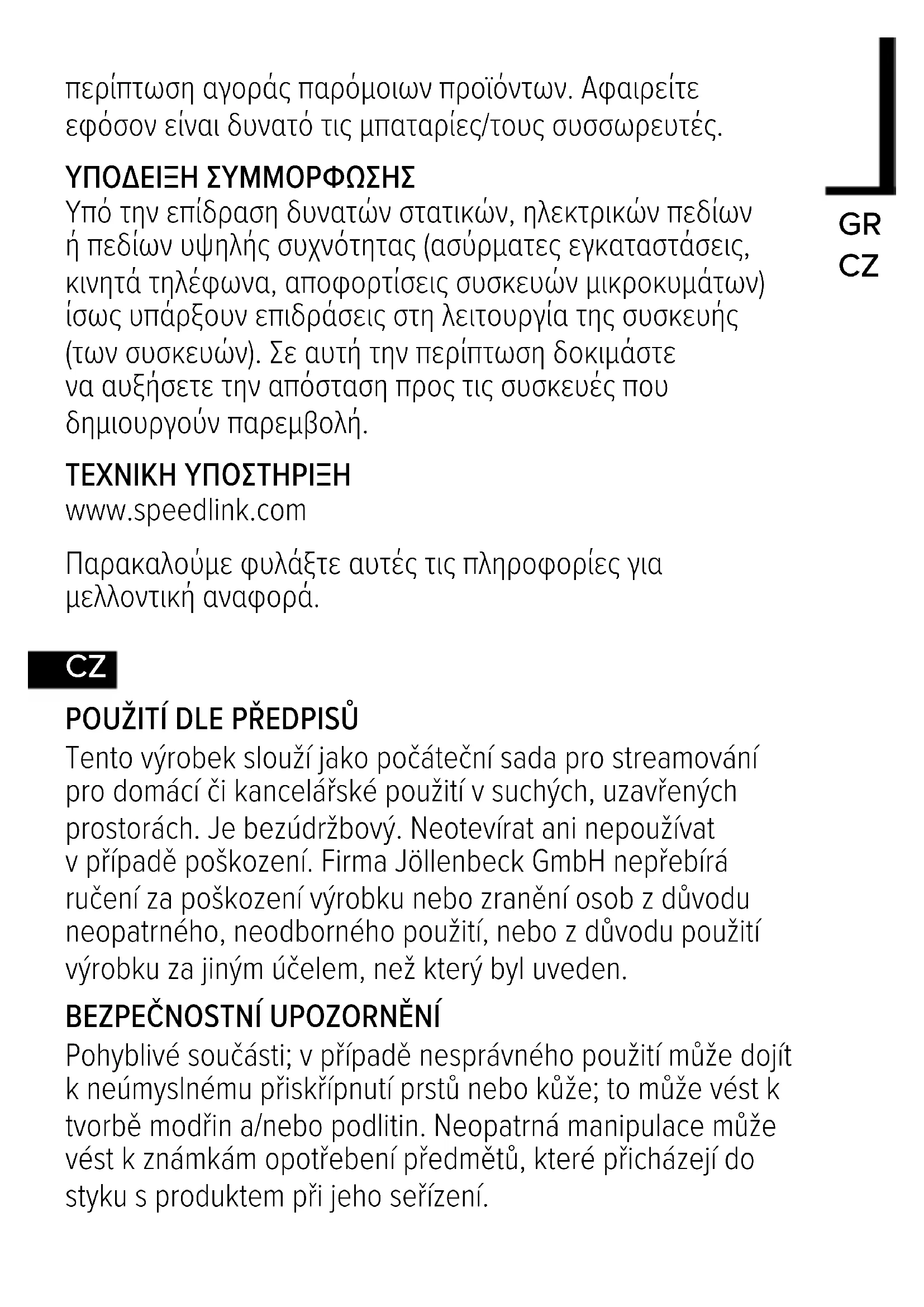 Za působení silných statických, elektrických, nebo vysokofrekvenčních polí (rádiová zařízení, mobilní telefony, mikrovlnné výboje) může dojít k omezení funkčnosti přístroje (přístrojů). V takovém případě se pokuste zvětšit distanci k rušivým přístrojům. TECHNICKÝ SUPORT www.speedlink.com Tyto informace uchovejte pro budoucí potřebu.