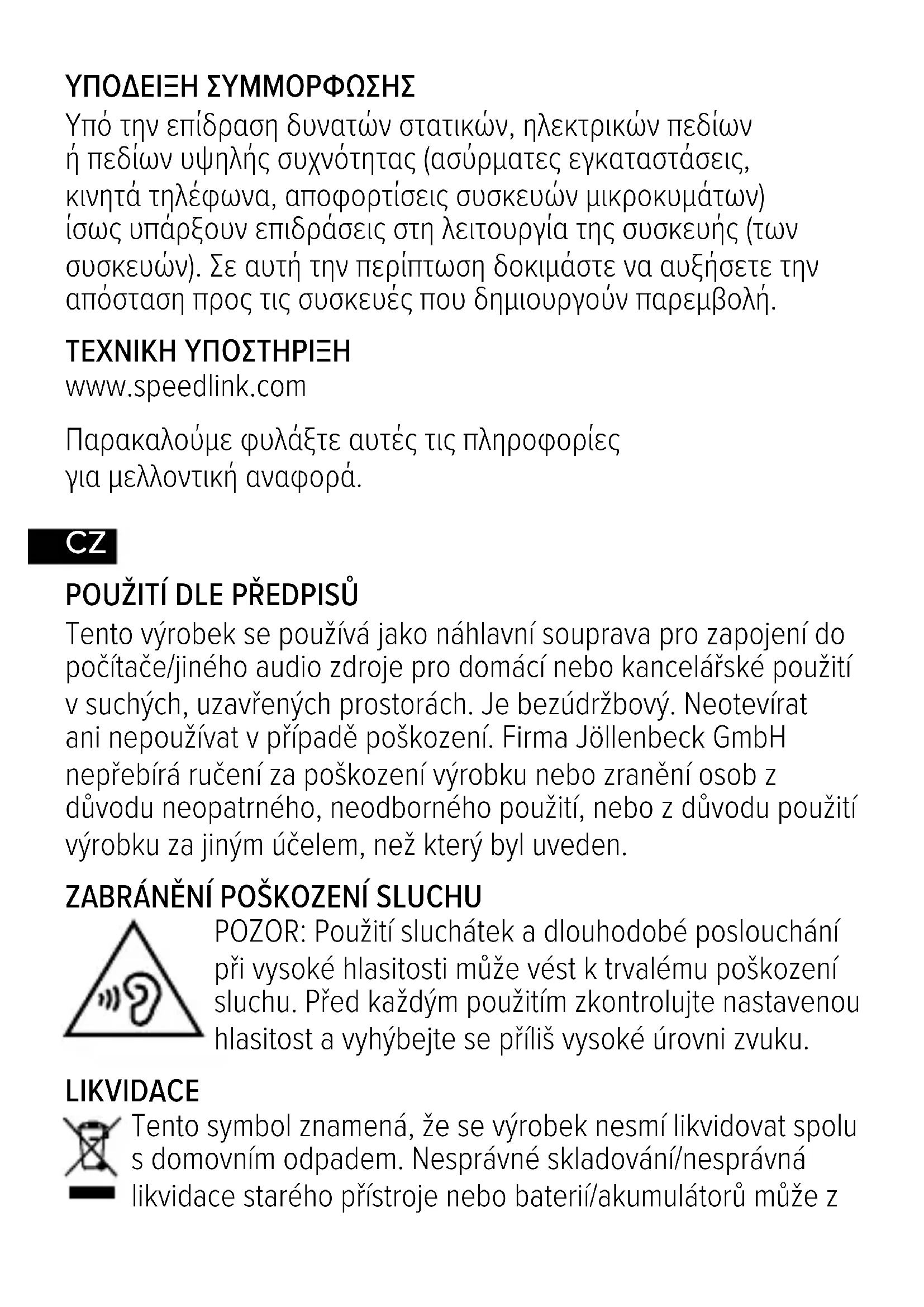 Za působení silných statických, elektrických, nebo vysokofrekvenčních polí (rádiová zařízení, mobilní telefony, mikrovlnné výboje) může dojít k omezení funkčnosti přístroje (přístrojů). V takovém případě se pokuste zvětšit distanci k rušivým přístrojům. TECHNICKÝ SUPORT www.speedlink.com Tyto informace uchovejte pro budoucí potřebu.