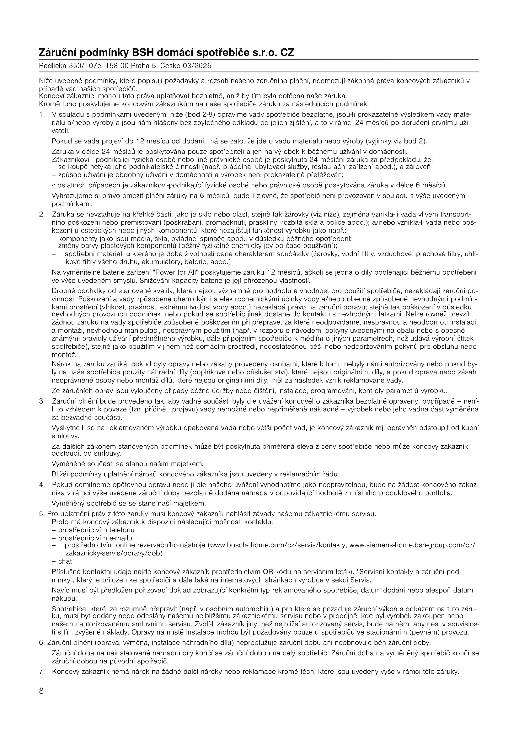 указанията за инсталиране, предоставени на купувача. 7Záruční podmínky BSH domácí spotřebiče s.r.o. CZ Radlická 350/107c, 158 00 Praha 5, Česko 03/2025 Níže uvedené podmínky, které popisují požadavky a rozsah našeho záručního plnění, neomezují zákonná práva koncových zákazníků v případě vad našich spotřebičů. Koncoví zákazníci mohou tato práva uplatňovat bezplatně, aniž by tím byla dotčena naše záruka. Kromě toho poskytujeme koncovým zákazníkům na naše spotřebiče záruku za následujících podmínek: 1. V souladu s podmínkami uvedenými níže (bod 2-8) opravíme vady spotřebiče bezplatně, jsou-li prokazatelně výsledkem vady mate- riálu a/nebo výroby a jsou nám hlášeny bez zbytečného odkladu po jejich zjištění, a to v rámci 24 měsíců po doručení prvnímu uži- vateli. Pokud se vada projeví do 12 měsíců od dodání, má se zato, že jde o vadu materiálu nebo výroby (výjimky viz bod 2). Záruka v délce 24 měsíců je poskytována pouze spotřebiteli a jen na výrobek k běžnému užívání v domácnosti. Zákazníkovi - podnikající fyzická osobě nebo jiné právnické osobě je poskytnuta 24 měsíční záruka za předpokladu, že: – se koupě netýká jeho podnikatelské činnosti (např. prádelna, ubytovací služby, restaurační zařízení apod.), a zároveň – způsob užívání je obdobný užívání v domácnosti a výrobek není prokazatelně přetěžován; v ostatních případech je zákazníkovi-podnikající fyzické osobě nebo právnické osobě poskytována záruka v délce 6 měsíců. Vyhrazujeme si právo omezit plnění záruky na 6 měsíců, bude-li zjevné, že spotřebič není provozován v souladu s výše uvedenými podmínkami. 2. Záruka se nevztahuje na křehké části, jako je sklo nebo plast, stejně tak žárovky (viz níže), zejména vznikla-li vada vlivem transport- ního poškození nebo přemisťování (poškrábání, promáčknutí, praskliny, rozbitá skla a police apod.); a/nebo vznikla-li vada nebo poš- kození u estetických nebo jiných komponentů, které nezajišťují funkčnost výrobku jako např.: – komponenty jako jsou madla, skla, ovládací spínače apod., v důsledku běžného opotřebení; – změny barvy plastových komponentů (běžný fyzikálně chemický jev po čase používání); – spotřební materiál, u kterého je doba životnosti daná charakterem součástky (žárovky, vodní filtry, vzduchové, prachové filtry, uhlí- kové filtry všeho druhu, akumulátory, baterie, apod.) Na vyměnitelné baterie zařízení "Power for All" poskytujeme záruku 12 měsíců, ačkoli se jedná o díly podléhající běžnému opotřebení ve výše uvedeném smyslu. Snižování kapacity baterie je její přirozenou vlastností. Drobné odchylky od stanovené kvality, které nejsou významné pro hodnotu a vhodnost pro použití spotřebiče, nezakládají záruční po- vinnost. Poškození a vady způsobené chemickými a elektrochemickými účinky vody a/nebo obecně způsobené nevhodnými podmín- kami prostředí (vlhkost, prašnost, extrémní tvrdost vody apod.) nezakládá právo na záruční opravu; stejně tak poškození v důsledku nevhodných provozních podmínek, nebo pokud se spotřebič jinak dostane do kontaktu s nevhodnými látkami. Nelze rovněž převzít žádnou záruku na vady spotřebiče způsobené poškozením při přepravě, za které neodpovídáme, nesprávnou a neodbornou instalací a montáží, nevhodnou manipulací, nesprávným použitím (např. v rozporu s návodem, pokyny uvedenými na obalu nebo s obecně známými pravidly užívání předmětného výrobku, dále připojením spotřebiče k médiím o jiných parametrech, než udává výrobní štítek spotřebiče), stejně jako použitím v jiném než domácím prostředí, nedostatečnou péčí nebo nedodržováním pokynů pro obsluhu nebo montáž. Nárok na záruku zaniká, pokud byly opravy nebo zásahy provedeny osobami, které k tomu nebyly námi autorizovány nebo pokud by- ly na naše spotřebiče použity náhradní díly (doplňkové nebo příslušenství), které nejsou originálními díly, a pokud oprava nebo zásah neoprávněné osoby nebo montáž dílů, které nejsou originálními díly, měl za následek vznik reklamované vady. Ze záručních oprav jsou vyloučeny případy běžné údržby nebo čištění, instalace, programování, kontroly parametrů výrobku. 3. Záruční plnění bude provedeno tak, aby vadné součásti byly dle uvážení koncového zákazníka bezplatně opraveny, popřípadě – není- li to vzhledem k povaze (tzn. příčině i projevu) vady nemožné nebo nepřiměřeně nákladné – výrobek nebo jeho vadná část vyměněna za bezvadné součásti. Vyskytne-li se na reklamovaném výrobku opakovaná vada nebo větší počet vad, je koncový zákazník mj. oprávněn odstoupit od kupní smlouvy. Za dalších zákonem stanovených podmínek může být poskytnuta přiměřená sleva z ceny spotřebiče nebo může koncový zákazník odstoupit od smlouvy. Vyměněné součásti se stanou naším majetkem. Bližší podmínky uplatnění nároků koncového zákazníka jsou uvedeny v reklamačním řádu. 4. Pokud odmítneme opětovnou opravu nebo ji dle našeho uvážení vyhodnotíme jako neopravitelnou, bude na žádost koncového zákaz- níka v rámci výše uvedené záruční doby bezplatně dodána náhrada v odpovídající hodnotě z místního produktového portfolia. Vyměněný spotřebič se se stane naší majetkem.