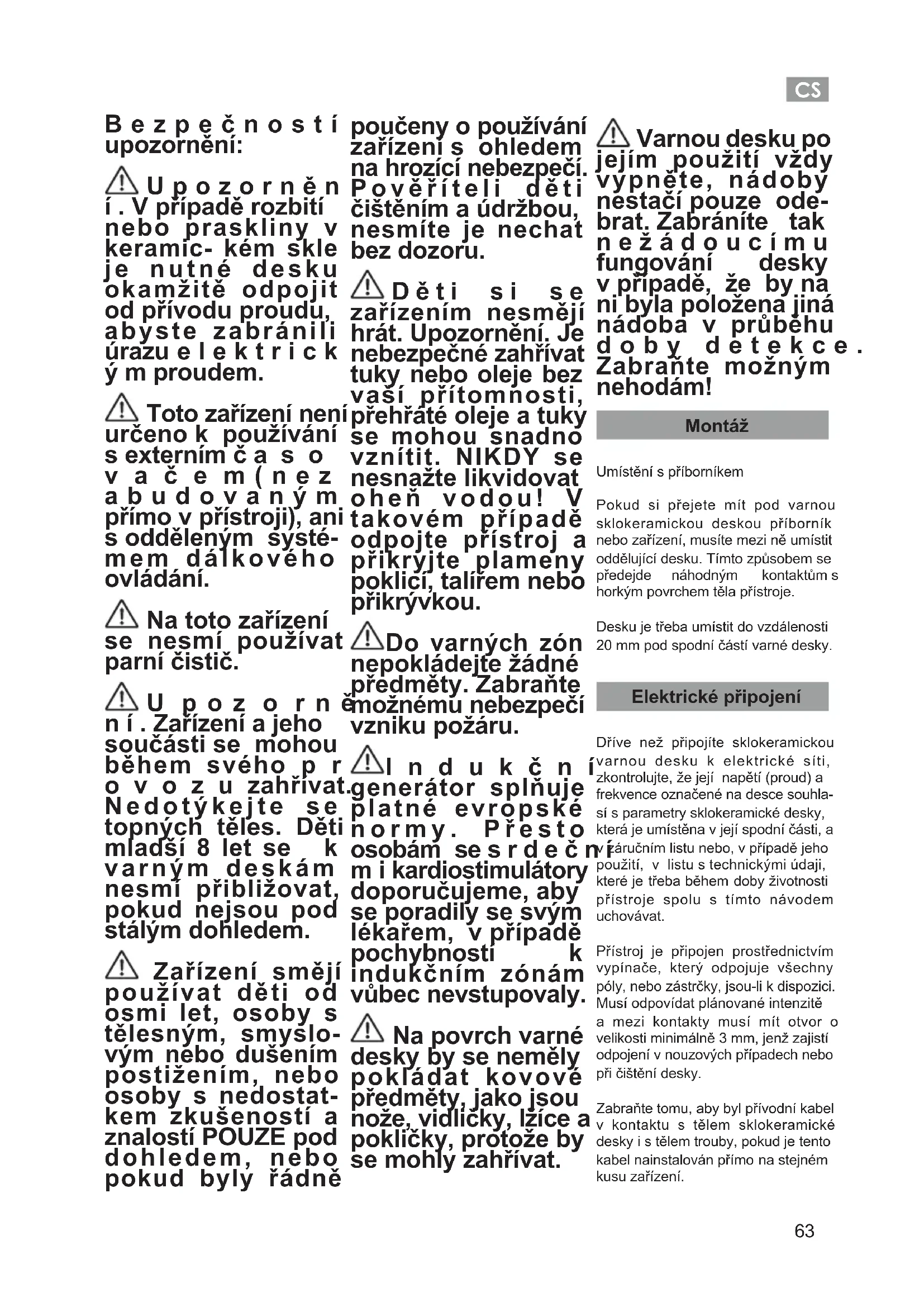 Bezpečností upozornění: U p o z o r n ě n í . V případě rozbití nebo praskliny v keramic- kém skle je nutné desku okamžitě odpojit od přívodu proudu, abyste zabránili úrazu e l e k t r i c k ý m proudem. Toto zařízení není určeno k používání s externím č a s o v a č e m ( n e z a b u d o v a n ý m přímo v přístroji), ani s odděleným systé- mem dálkového ovládání. Na toto zařízení se nesmí používat parní čistič. U p o z o r n ě n í . Zařízení a jeho součásti se mohou během svého p r o v o z u zahřívat. Nedotýkejte se topných těles. Děti mladší 8 let se k varným deskám nesmí přibližovat, pokud nejsou pod stálým dohledem. Zařízení smějí používat děti od osmi let, osoby s tělesným, smyslo- vým nebo dušením postižením, nebo osoby s nedostat- kem zkušeností a znalostí POUZE pod dohledem, nebo pokud byly řádně poučeny o používání zařízení s ohledem na hrozící nebezpečí. Pověříteli děti čištěním a údržbou, nesmíte je nechat bez dozoru. Děti si se zařízením nesmějí hrát. Upozornění. Je nebezpečné zahřívat tuky nebo oleje bez vaší přítomnosti, přehřáté oleje a tuky se mohou snadno vznítit. NIKDY se nesnažte likvidovat oheň vodou! V takovém případě odpojte přístroj a přikryjte plameny poklicí, talířem nebo přikrývkou. Do varných zón nepokládejte žádné předměty. Zabraňte možnému nebezpečí vzniku požáru. I n d u k č n í generátor splňuje platné evropské normy. Přesto osobám se s r d e č n í m i kardiostimulátory doporučujeme, aby se poradily se svým lékařem, v případě pochybností k indukčním zónám vůbec nevstupovaly. Na povrch varné desky by se neměly pokládat kovové předměty, jako jsou nože, vidličky, lžíce a pokličky, protože by se mohly zahřívat. Varnou desku po jejím použití vždy vypněte, nádoby nestačí pouze ode- brat. Zabráníte tak n e ž á d o u c í m u fungování desky v případě, že by na ni byla položena jiná nádoba v průběhu doby detekce. Zabraňte možným nehodám! Montáž Umístění s příborníkem Pokud si přejete mít pod varnou sklokeramickou deskou příborník nebo zařízení, musíte mezi ně umístit oddělující desku. Tímto způsobem se předejde náhodným kontaktům s horkým povrchem těla přístroje. Desku je třeba umístit do vzdálenosti 20 mm pod spodní částí varné desky. Elektrické připojení Dříve než připojíte sklokeramickou varnou desku k elektrické síti, zkontrolujte, že její napětí (proud) a frekvence označené na desce souhla- sí s parametry sklokeramické desky, která je umístěna v její spodní části, a v záručním listu nebo, v případě jeho použití, v listu s technickými údaji, které je třeba během doby životnosti přístroje spolu s tímto návodem uchovávat. Přístroj je připojen prostřednictvím vypínače, který odpojuje všechny póly, nebo zástrčky, jsou-li k dispozici. Musí odpovídat plánované intenzitě a mezi kontakty musí mít otvor o velikosti minimálně 3 mm, jenž zajistí odpojení v nouzových případech nebo při čištění desky. Zabraňte tomu, aby byl přívodní kabel v kontaktu s tělem sklokeramické desky i s tělem trouby, pokud je tento kabel nainstalován přímo na stejném kusu zařízení.CS