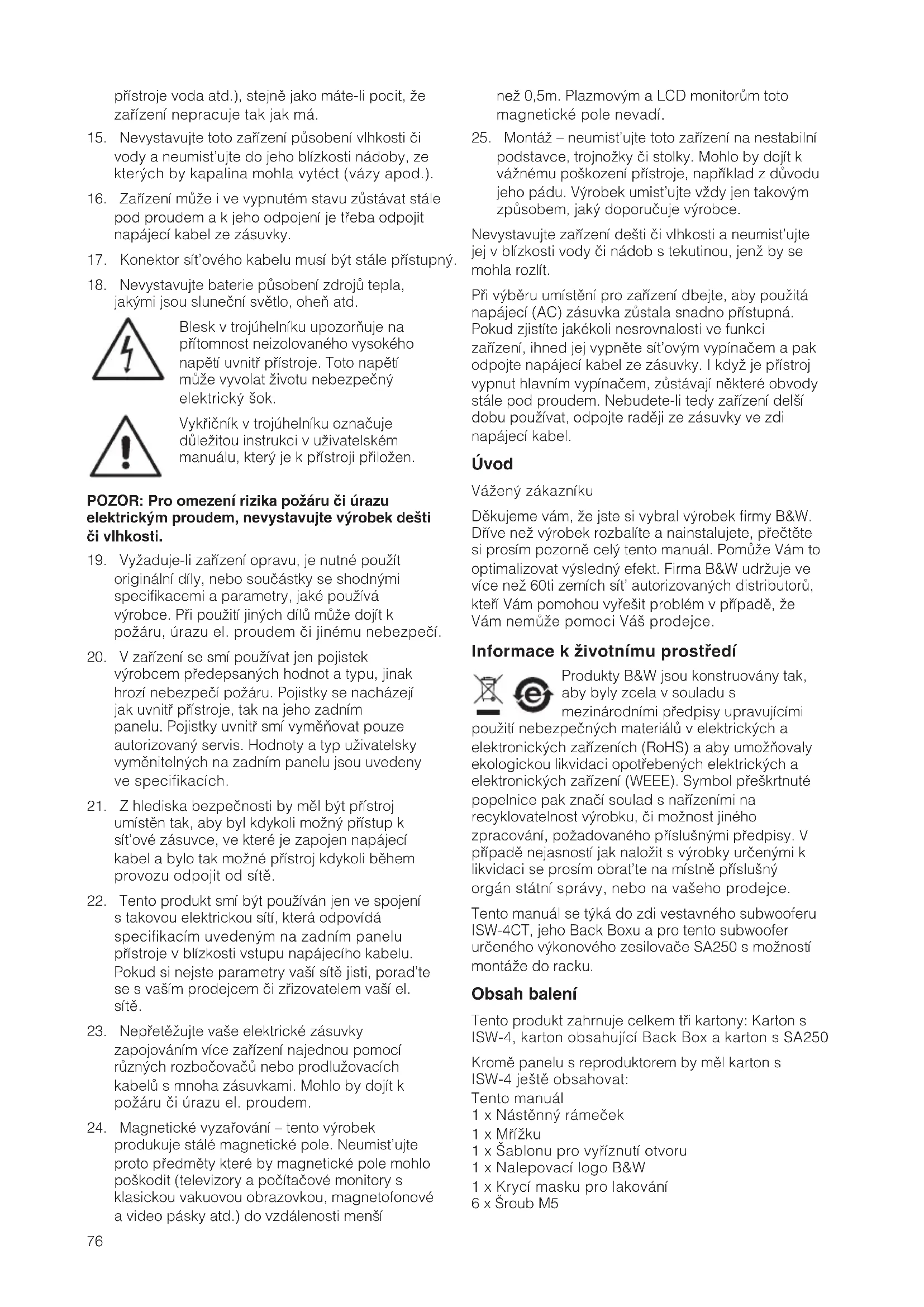 Záruka V≥robky firmy B&W jsou vyráb>ny tak, aby vyhov>ly v|em poãadavkÅm na|eho náro#ného zákazníka. Nicmén>, vznikne-li p_esto n>jaká závada, firma B&W Group Ltd. a její místní dovozce ud>lají v|e pot_ebné, aby vá| v≥robek byl bezplatn> (krom uveden≥ch v≥jimek) opraven #i uveden do _ádného stavu. Záruka b>ãí po dobu 5 let a vztahuje se na neelektronické sou#ásti v≥robku. Dvouletá záruka je pak poskytována na ve|keré elektronické sou#ásti v≥robkÅ v#etn> zesilova#Å aktivních reprosoustav. Podmínky záruky 1 Záruka se vztahuje pouze na opravy v≥robkÅ. Nepokr≥vá p_epravu reklamovaného v≥robku do servisního st_ediska, manipulaci s ním a ani ãádná rizika z p_epravy a manipulace plynoucí. 2 Záruka platí pouze pro prvního kupce v≥robku, p_i dal|ím prodeji se jiã nep_ená|í. 3 Práva vypl≥vající ze záruky nebudou uznána v p_ípad> jin≥ch závad neã závad materiálu a dílenského zpracování a dále zejména v t>chto p_ípadech: a. v≥robky byly |patn> nainstalovány, zapojeny nebo |patn> uskladn>ny #i zabaleny, b. v≥robky byly zapojeny #i pouãity jinak neã se uvádí v návodu k pouãití, byla zanedbána jejich údrãba, byly modifikovány nebo byly pouãity jiné neã originální náhradní díly, c. v≥robky byly pouãívány spole#n> s nevhodn≥m za_ízením, d. v≥robky byly po|kozeny nehodou, bleskem, vodou, ohn>m, válkou, ve_ejn≥mi nepokoji nebo n>jakou jinou okolností za kterou firma B&W Group Ltd. ani její místní dovozce nemohou nést odpov>dnost, e. v≥robní #íslo v≥robkÅ bylo zm>n>no, smazáno, odstran>no nebo se stalo ne#iteln≥m, f. v≥robky byly opravovány neautorizovanou osobou. 7702 ISW-4 manual.indd 81 6/4/09 10:37:1582 4 Tato záruka dopl[uje místní právní úpravu záru#ní doby dle té které zem> a neplatí v t>ch bodech, které jsou s místní právní úpravou v rozporu. To neplatí v p_ípadech, kdy tato záruka jde nad rámec místní úpravy. Uplatn>ní záruky Uplat[ujete-li reklamaci, postupujte prosím dle následujících krokÅ: 1 Reklamujete-li v≥robek v zemi, ve které byl i zakoupen, kontaktujte autorizovaného prodejce v≥robkÅ B&W, kde jste v≥robek zakoupili. 2 Reklamujete-li v≥robek v jiné zemi, neã ve které byl zakoupen, kontaktujte dovozce, kter≥ servis zajistí. P_íslu|ného dovozce zjistíte bud’ p_ímo telefonicky u firmy B&W nebo na jejich www stránkách. P_i uplat[ování záruky se vãdy prokazujte záru#ním listem, kter≥ musí b≥t opat_en datem prodeje, razítkem a podpisem autorizovaného prodejce. Alternativn> se mÅãete prokázat paragonem #i fakturou na základ> které jste v≥robek koupili. I tyto doklady musí obsahovat datum, podpis a razítko autorizovaného prodejce. Polski Instrukcja instalacji i ustawie◊