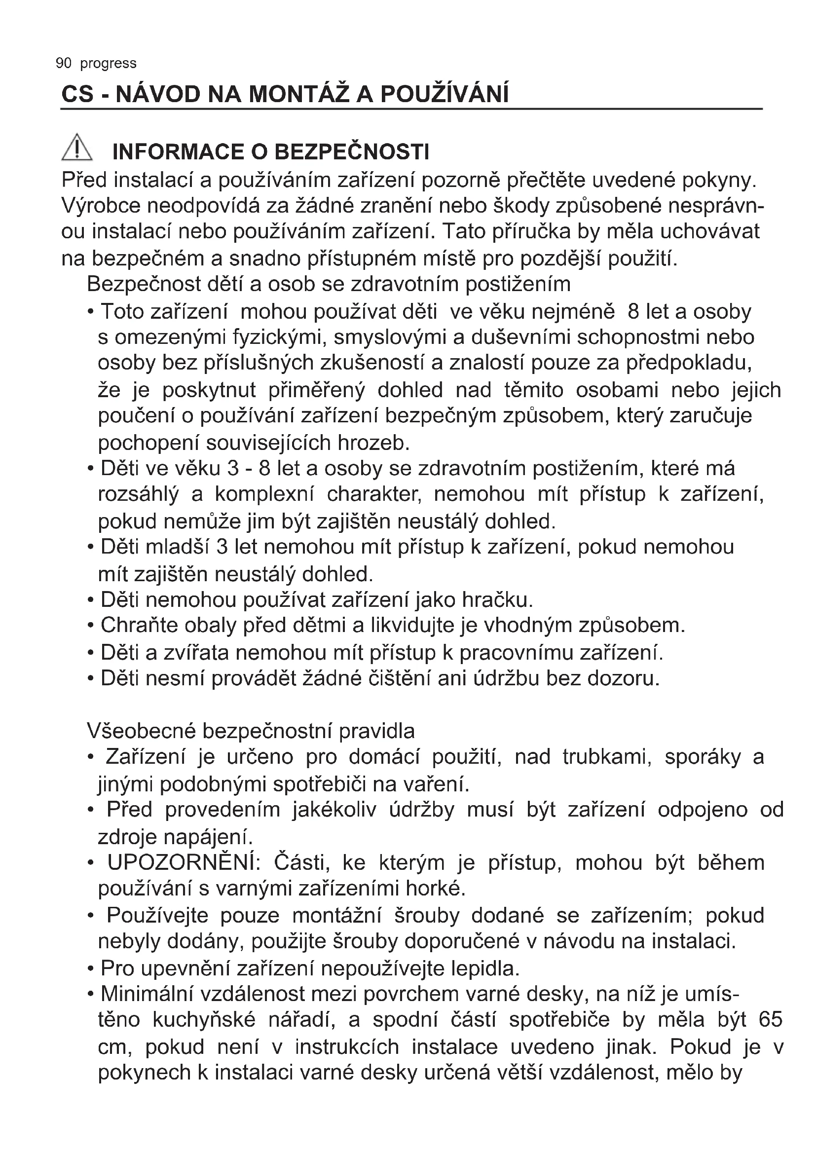 - Minimální vzdálenost mezi povrchem varné desky, na níž je umís- těno kuchyňské nářadí, a spodní částí spotřebiče by měla být 65 cm, pokud není v instrukcích instalace uvedeno jinak. Pokud je v pokynech k instalaci varné desky určená větší vzdálenost, mělo byprogress 91 se toto zohlednit.