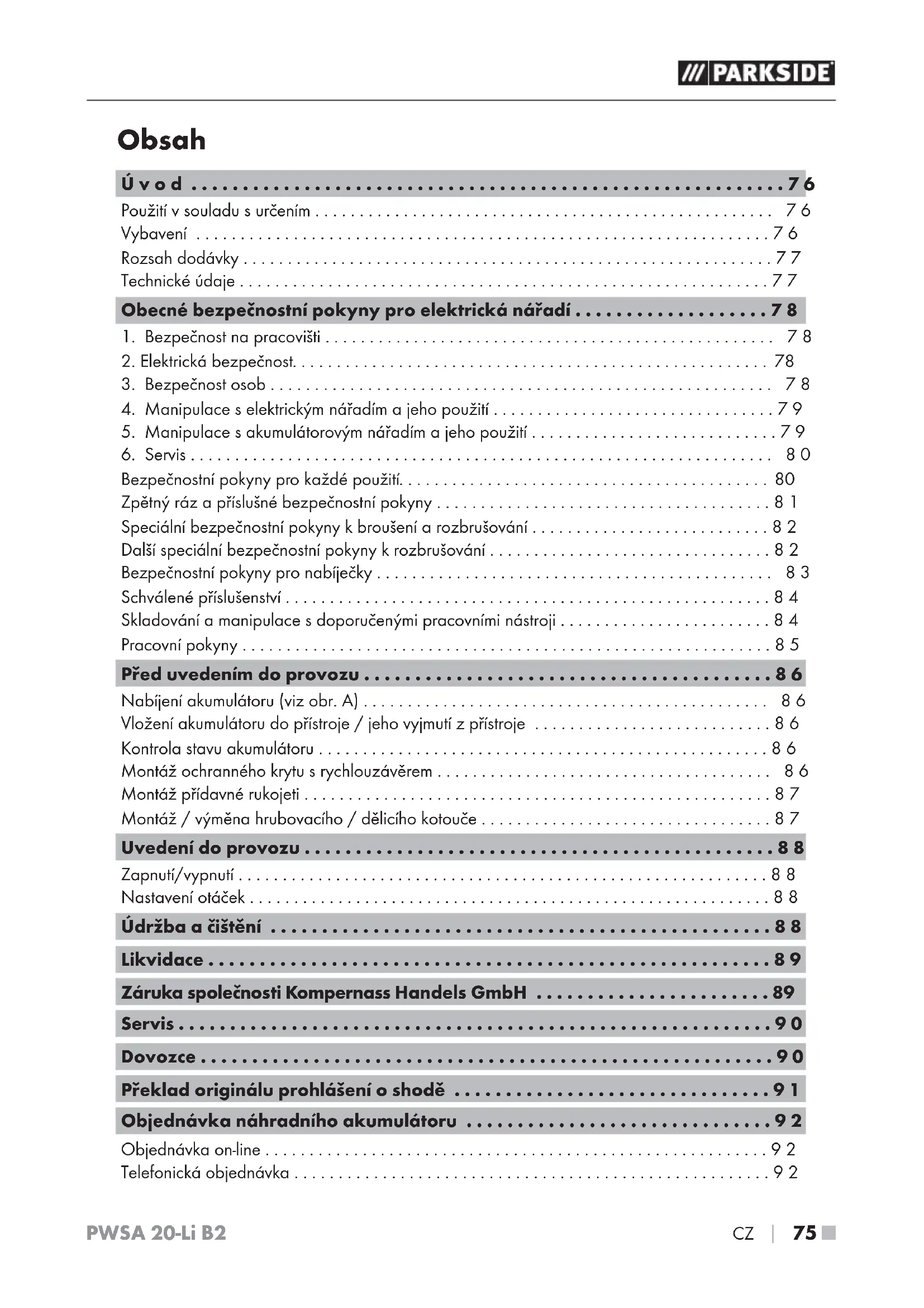 NÁVOD K OBSLUZE PWSA 20Li B2 PARKSIDE