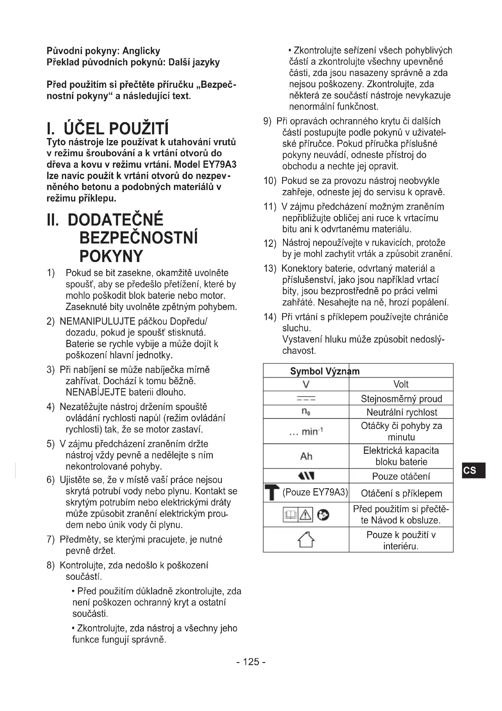 sluchu. Vystavení hluku může způsobit nedoslý- chavost. Symbol Význam Volt Stejnosměrný proud Neutrální rychlost Otáčky či pohyby za minutu Elektrická kapacita bloku baterie Pouze otáčení (Pouze EY79A3) Otáčení s příklepem Před použitím si přečtě- te Návod k obsluze. Pouze k použití v interiéru.- 126 -