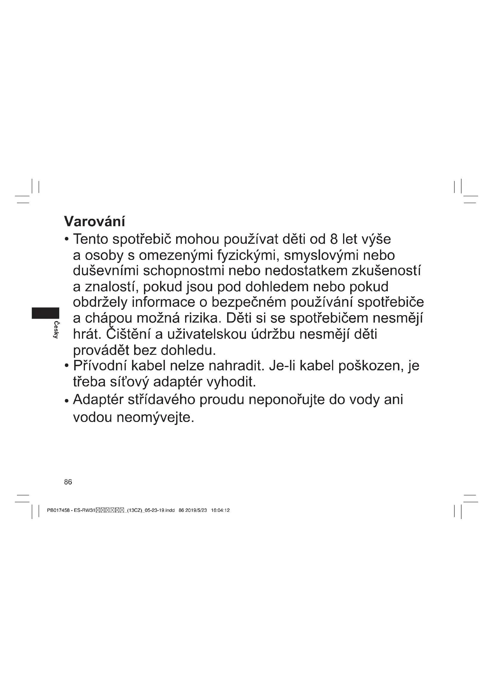 - Přívodní kabel nelze nahradit. Je-li kabel poškozen, je třeba síťový adaptér vyhodit. PB017458 - ES-RW31_(13CZ)_05-23-19.indd 86 2019/5/23 16:04:12 Adaptér střídavého proudu neponořujte do vody ani vodou neomývejte.87 Česky