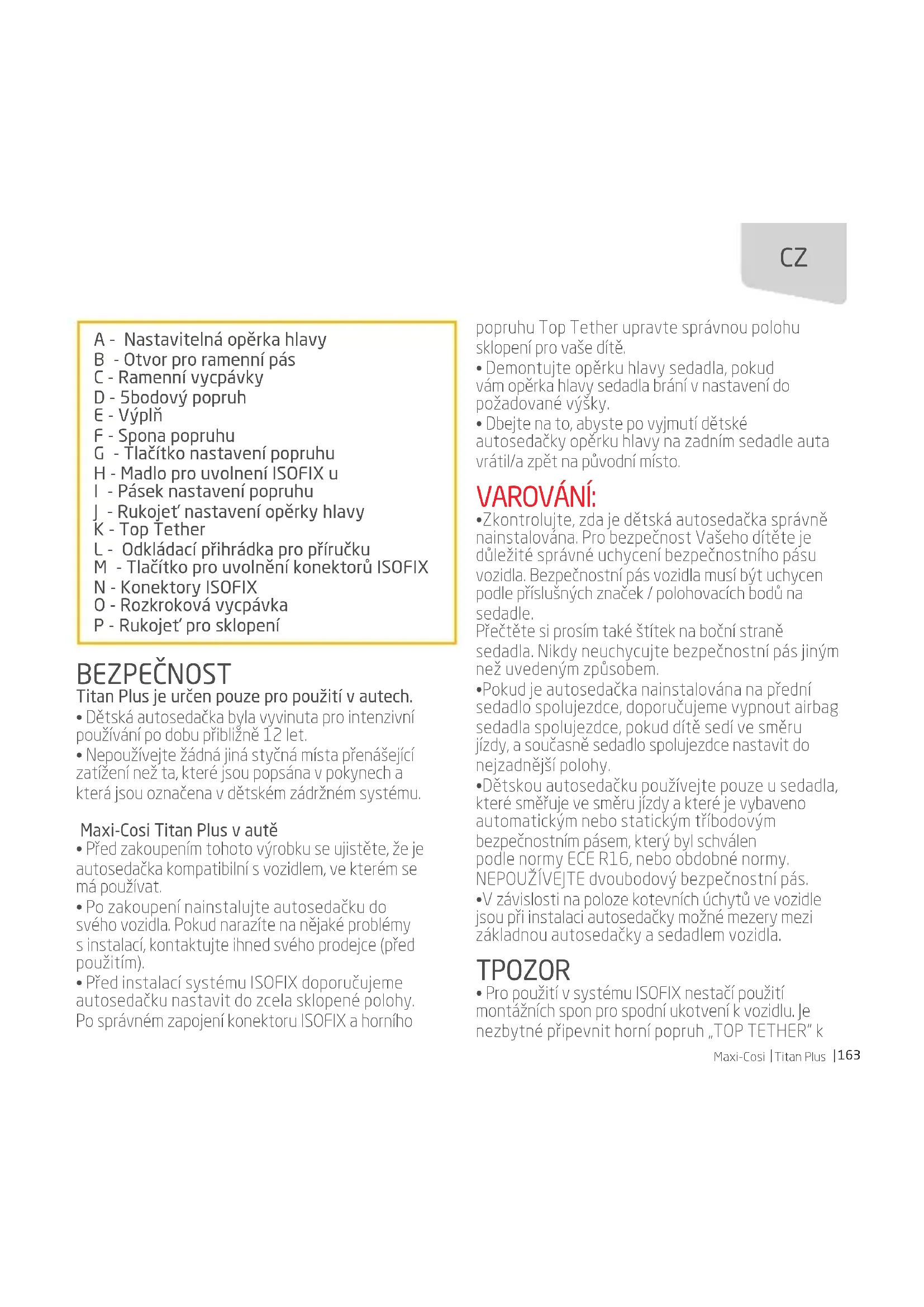 A - Nastavitelná opěrka hlavy B - Otvor pro ramenní pás C - Ramenní vycpávky D - 5bodový popruh E - Výplň F - Spona popruhu G - Tlačítko nastavení popruhu H - Madlo pro uvolnení ISOFIX u I - Pásek nastavení popruhu J - Rukojeť nastavení opěrky hlavy K - Top Tether L - Odkládací přihrádka pro příručku M - Tlačítko pro uvolnění konektorů ISOFIX N - Konektory ISOFIX O - Rozkroková vycpávka P - Rukojeť pro sklopení164
