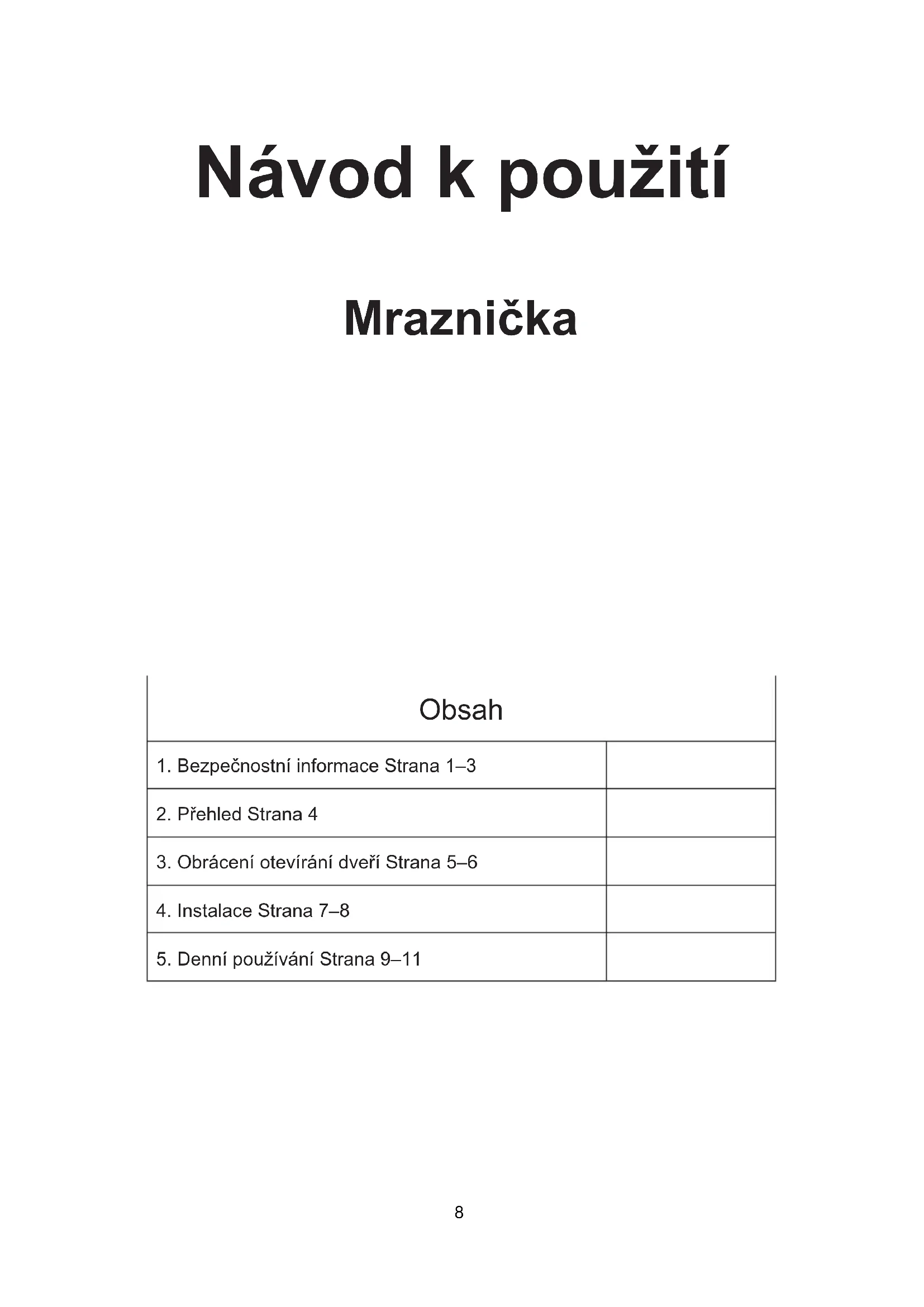 86EŠTINA Dkujeme vám za zakoupení tohoto výrobku. Ped použitím chladniky si pozorn pette tento návod k použití, abyste mohli maximáln využít jejích možností. Uchovejte veškerou dokumentaci pro budoucí použití nebo další vlastníky. Tento výrobek je uren výhradn pro použití v domácnosti nebo podobná použití, jako jsou: - kuchyské kouty pro zamstnance v obchodech, kanceláích a na dalších pracovištích, - na statcích, pro klientelu hotel, motel a dalších ubytovacích zaízení, - v ubytovacích zaízeních typu B&B (ubytování se snídaní), - pro cateringové služby a podobné úely, nikoliv však pro maloobchodní prodej. Tento spotebi se smí používat pouze pro úely skladování potravin, piemž jakékoliv jiné použití je považováno za nebezpené a výrobce nenese odpovdnost za pípadné nedodržení pokyn. Doporuujeme vám také, abyste se seznámili se záruními podmínkami. BEZPENOSTNÍ INFORMACE Chladnika obsahuje chladicí plyn (R600a: isobutan) a izolaní plyn (cyklopentan), které jsou šetrné k životnímu prostedí, nicmén jsou holavé. Doporuujeme vám, abyste dodržovali následující pokyny, ímž se vyhnete nebezpeným situacím: Ped provedením jakéhokoliv úkonu odpojte napájecí kabel ze zásuvky.