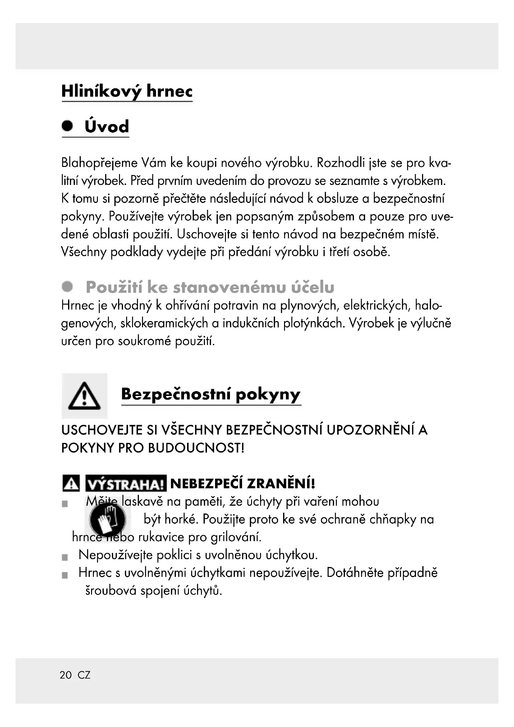 Afvoer De verpakking bestaat uit milieuvriendelijke grondstoffen die u via de plaatselijke recyclingcontainers kunt afvoeren. Informatie over de mogelijkheden om het uitgediende product na ge- bruik te verwijderen, verstrekt uw gemeentelijke overheid. Garantie Het product wordt volgens strenge kwaliteitsrichtlijnen zorgvuldig ge- produceerd en voor levering grondig getest. In geval van schade aan het product kunt u rechtmatig beroep doen op de verkoper van het product. Deze wettelijke rechten worden door onze hierna vermelde garantie niet beperkt. Op dit product verlenen wij 3 jaar garantie vanaf aankoopdatum. De garantieperiode start op de dag van aankoop. Bewaar de originele kassabon alstublieft. Dit document is nodig als bewijs voor aankoop. Wanneer binnen 3 jaar na de aankoopdatum van dit product een ma- teriaal- of productiefout optreedt, dan wordt het product door ons – naar onze keuze – gratis voor u gerepareerd of vervangen. Deze garantie komt te vervallen als het product beschadigd wordt, niet correct gebruikt of onderhouden wordt. De garantie geldt voor materiaal- en productiefouten. Deze garantie is niet van toepassing op productonderdelen, die onderhevig zijn aan normale slijtage en hierdoor als aan slijtage onderhevige onderdelen gelden (bijv. batterijen) of voor beschadigingen aan breekbare onder- delen, zoals bijv. schakelaars, accu’s of dergelijke onderdelen, die gemaakt zijn van glas.20 CZ Hliníkový hrnec Úvod Blahopřejeme Vám ke koupi nového výrobku. Rozhodli jste se pro kva- litní výrobek. Před prvním uvedením do provozu se seznamte s výrobkem. K tomu si pozorně přečtěte následující návod k obsluze a bezpečnostní pokyny. Používejte výrobek jen popsaným způsobem a pouze pro uve- dené oblasti použití. Uschovejte si tento návod na bezpečném místě. Všechny podklady vydejte při předání výrobku i třetí osobě. Použití ke stanovenému účelu Hrnec je vhodný kohřívání potravin na plynových, elektrických, halo- genových, sklokeramických a indukčních plotýnkách. Výrobek je výlučně určen pro soukromé použití. Bezpečnostní pokyny USCHOVEJTE SI VŠECHNY BEZPEČNOSTNÍ UPOZORNĚNÍ A POKYNY PRO BUDOUCNOST! NEBEZPEČÍ ZRANĚNÍ! Mějte laskavě na paměti, že úchyty při vaření mohou být horké. Použijte proto ke své ochraně chňapky na hrnce nebo rukavice pro grilování. Nepoužívejte poklici s uvolněnou úchytkou. Hrnec s uvolněnými úchytkami nepoužívejte. Dotáhněte případně šroubová spojení úchytů.21 CZ NEBEZPEČÍ POŠKOZENÍ VĚCÍ! Při vaření je velmi důležité, abyste hrnce a pánve, v nichž se ohřívá tuk, nespustili z očí. Tuk se může rychle přehřát a zapálit se. V pří- padě, že tuk jednou hoří, nikdy jej nehaste vodou! Plameny uduste poklicí nebo hustou vlněnou dekou. Aby se nepoškodil protiadhezivní povlak, použijte jen pomocníky do kuchyně zumělé hmoty odolné vůči horku nebo ze dřeva. Ne- krájejte dušené potraviny přímo v hrnci. Do horkého tuku nedávejte mokré maso. Vzhledem k tuku stříkají- címu na žhavou desku sporáku se může snadno vznítit požár. Šetřete energií! Kzabránění ztráty tepla zvolte příslušnou var- nou zónu podle průměru dna hrnce. 293043 (24 cm hliníkový hrnec) účinný průměr dna: cca. 18 cm 293046 (28 cm hliníkový hrnec) účinný průměr dna: cca. 22 cm. Výrobek bez poklice je vodný kudržování teploty pokrmů vpečicí troubě (max. 160 °C po dobu 1hodiny). Vysoké teploty mohou způsobit zabarvení vnějšího povrchu výrobku. V tomto případě se nejedná o chybu materiálu, kvalita nebo funkce výrobku není ovlivněna. Horký výrobek neomývat studenou tekoucí vodou. Spodní strana výrobku se může poškodit nebo odpadnout. Výrobek se hodí pro myčku na nádobí. Časté čištění ostrými čisticími prostředky může vést k poškození nebo zbarvení hrnce. Mytí v myčce na nádobí může způsobit zabarvení hliníkových dílů. POZOR! Skleněná poklice je rozbitelná / není odolná proti nárazům! Při ručním mytí hrnce používejte horkou vodu a běžný mycí pro- středek. Vyhněte se při tom použití ostrých a špičatých předmětů, aby se materiál nepoškodil. Výrobek neposunujte přes sklokeramické a halogenové plotýnky. Může dojít k poškození resp. poškrábání varných ploch.22 CZ Prosíme, vezměte na vědomí, že při použití tohoto výrobku může, z důvodu světlé barvy, dojít k mírnému zabarvení. Toto zabarvení je jen běžné opotřebení a nemá vliv na kvalitu, povrchovou úpravu ani funkci výrobku. Poznámka pro indukční varné desky Upozornění: za určitých podmínek se může vyskytovat hluk, který vyplývá z elektromagnetických vlastností zdroje tepla a hrnce / pánve. To je naprosto normální a neznamená, že indukční varná deska nebo vaše nádobí jsou poškozeny. Dejte hrnec / pánev do středu na indukční plotýnku. UPOZORNĚNÍ! Vysoká rychlost ohřevu! Nepřehřívejte nádobí při předehřívání. V případě, že se nádobí přehřeje, musí být místnost dobře větrána. Použití Odstraňte laskavě před prvním použitím eventuální nálepky z výrobku a vypláchněte jej horkou vodou. Před prvním použitím vyvařte hrnec 2 až 3krát vodou, aby se úplně vymyly eventuální nečistoty z výroby. Prázdný hrnec ani hrnec s obsahem nepřehřívejte, jeho povrchová úprava se může poškodit resp. nepřilnavost jeho povrchu snížit.