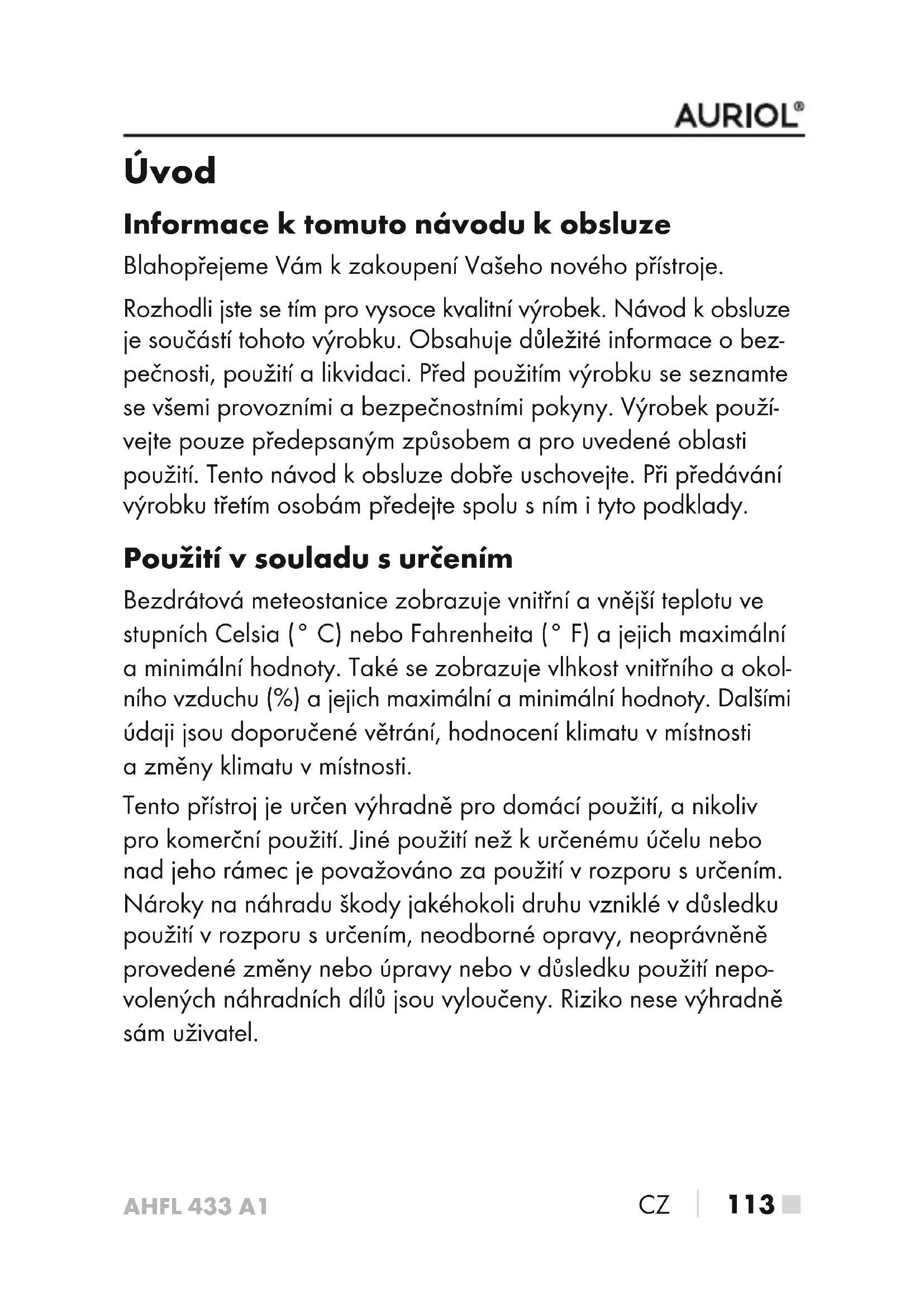 113 ■ Úvod Informace ktomuto návodu kobsluze Blahopřejeme Vám kzakoupení Vašeho nového přístroje. Rozhodli jste se tím pro vysoce kvalitní výrobek. Návod kobsluze je součástí tohoto výrobku. Obsahuje důležité informace obez- pečnosti, použití a likvidaci. Před použitím výrobku se seznamte se všemi provozními a bezpečnostními pokyny. Výrobek použí- vejte pouze předepsaným způsobem a pro uvedené oblasti použití. Tento návod kobsluze dobře uschovejte. Při předávání výrobku třetím osobám předejte spolu sním ityto podklady. Použití vsouladu surčením Bezdrátová meteostanice zobrazuje vnitřní a vnější teplotu ve stupních Celsia (° C) nebo Fahrenheita (° F) a jejich maximální a minimální hodnoty. Také se zobrazuje vlhkost vnitřního a okol- ního vzduchu (%) a jejich maximální a minimální hodnoty. Dalšími údaji jsou doporučené větrání, hodnocení klimatu v místnosti a změny klimatu v místnosti. Tento přístroj je určen výhradně pro domácí použití, a nikoliv pro komerční použití. Jiné použití než kurčenému účelu nebo nad jeho rámec je považováno za použití vrozporu surčením. Nároky na náhradu škody jakéhokoli druhu vzniklé vdůsledku použití vrozporu surčením, neodborné opravy, neoprávněně provedené změny nebo úpravy nebo vdůsledku použití nepo- volených náhradních dílů jsou vyloučeny. Riziko nese výhradně sám uživatel.AHFL 433 A1 ■ 114